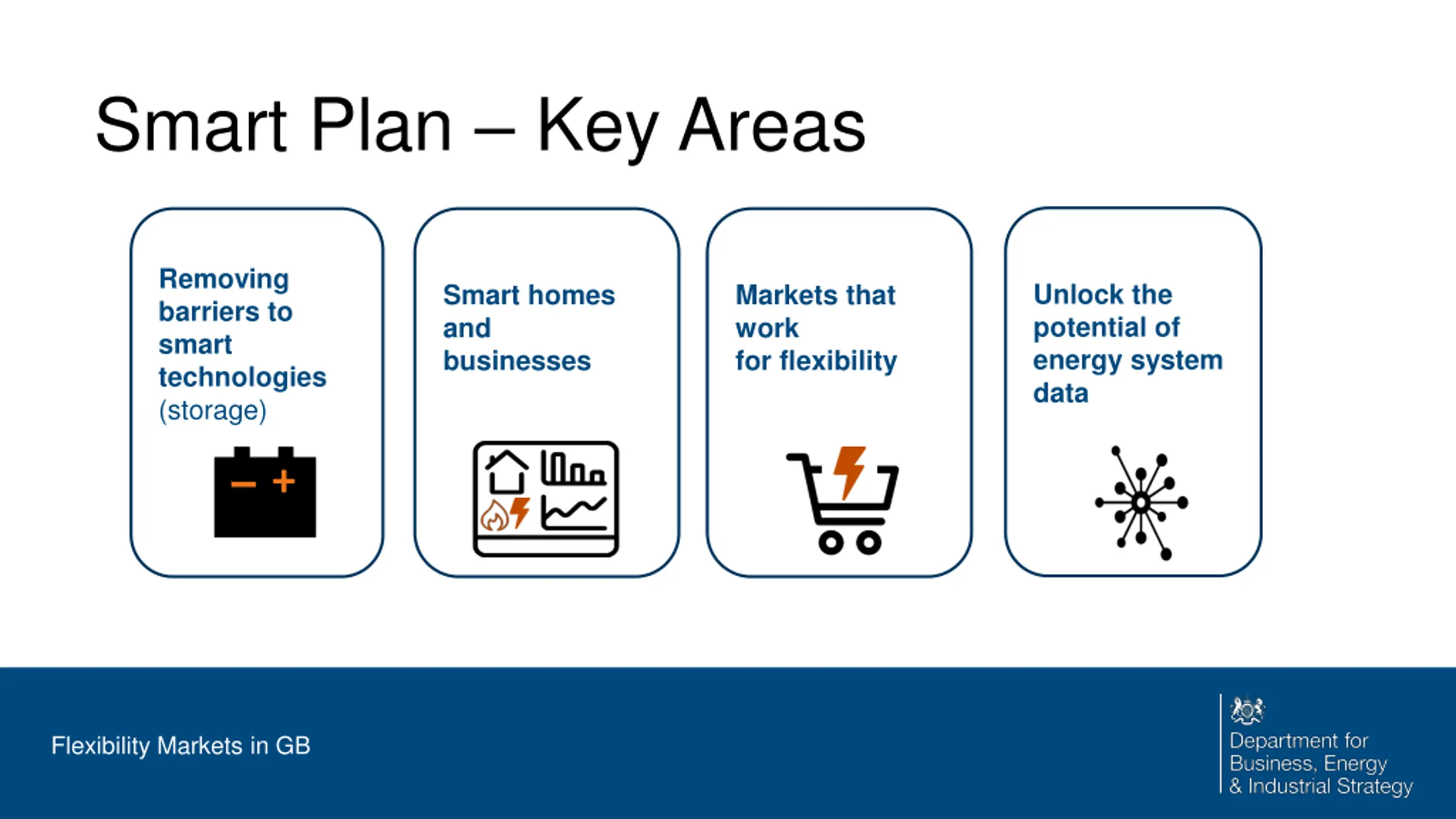 Smart Plan Key Areas Removing barriers to smart technologies (storage) Unlock the potential of energy system data Smart homes and businesses Markets that work for flexibility + Flexibility Markets in GB