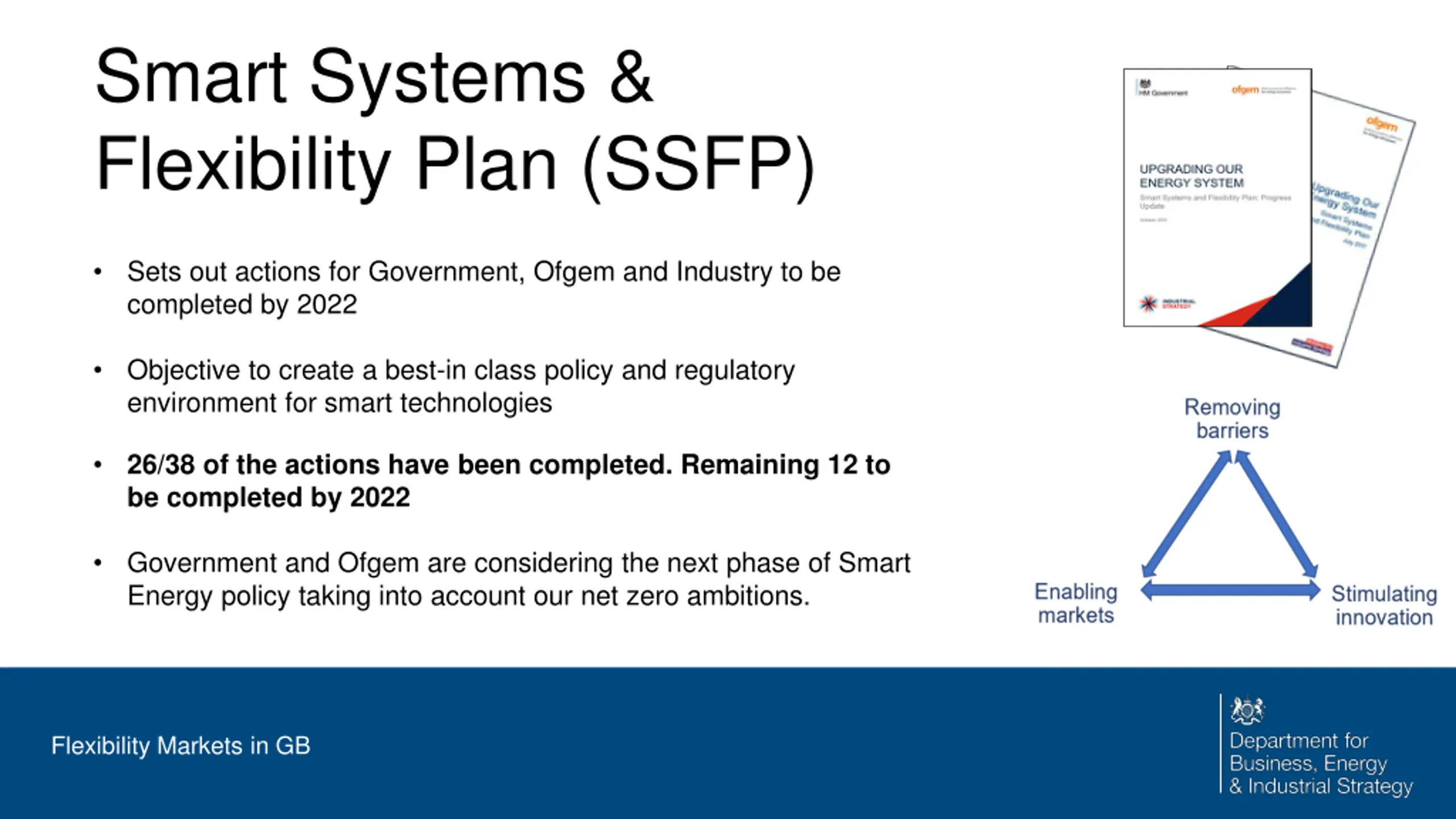 Smart Systems & Flexibility Plan (SSFP) Sets out actions for Government, Ofgem and Industry to be completed by 2022 Objective to create a best-in class policy and regulatory environment for smart technologies 26/38 of the actions have been completed. Remaining 12 to be completed by 2022 Government and Ofgem are considering the next phase of Smart Energy policy taking into account our net zero ambitions. Flexibility Markets in GB