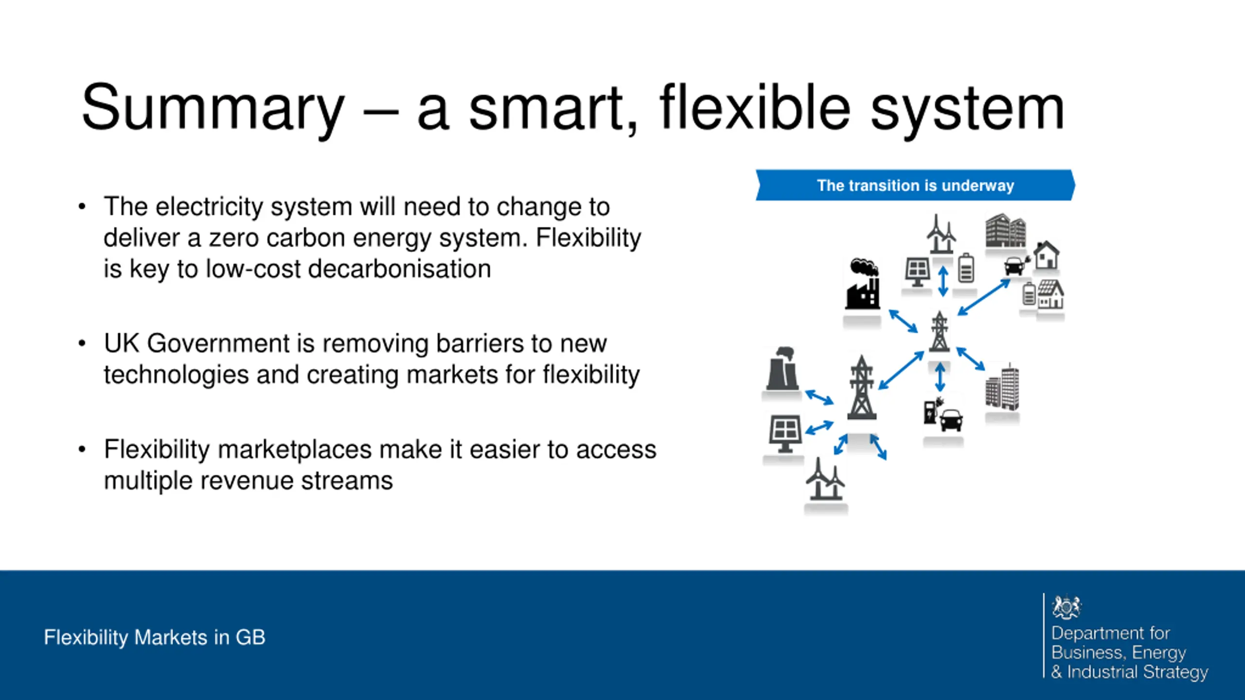 Summary a smart, flexible system The transition is underway The electricity system will need to change to deliver a zero carbon energy system. Flexibility is key to low-cost decarbonisation UK Government is removing barriers to new technologies and creating markets for flexibility Flexibility marketplaces make it easier to access multiple revenue streams Flexibility Markets in GB