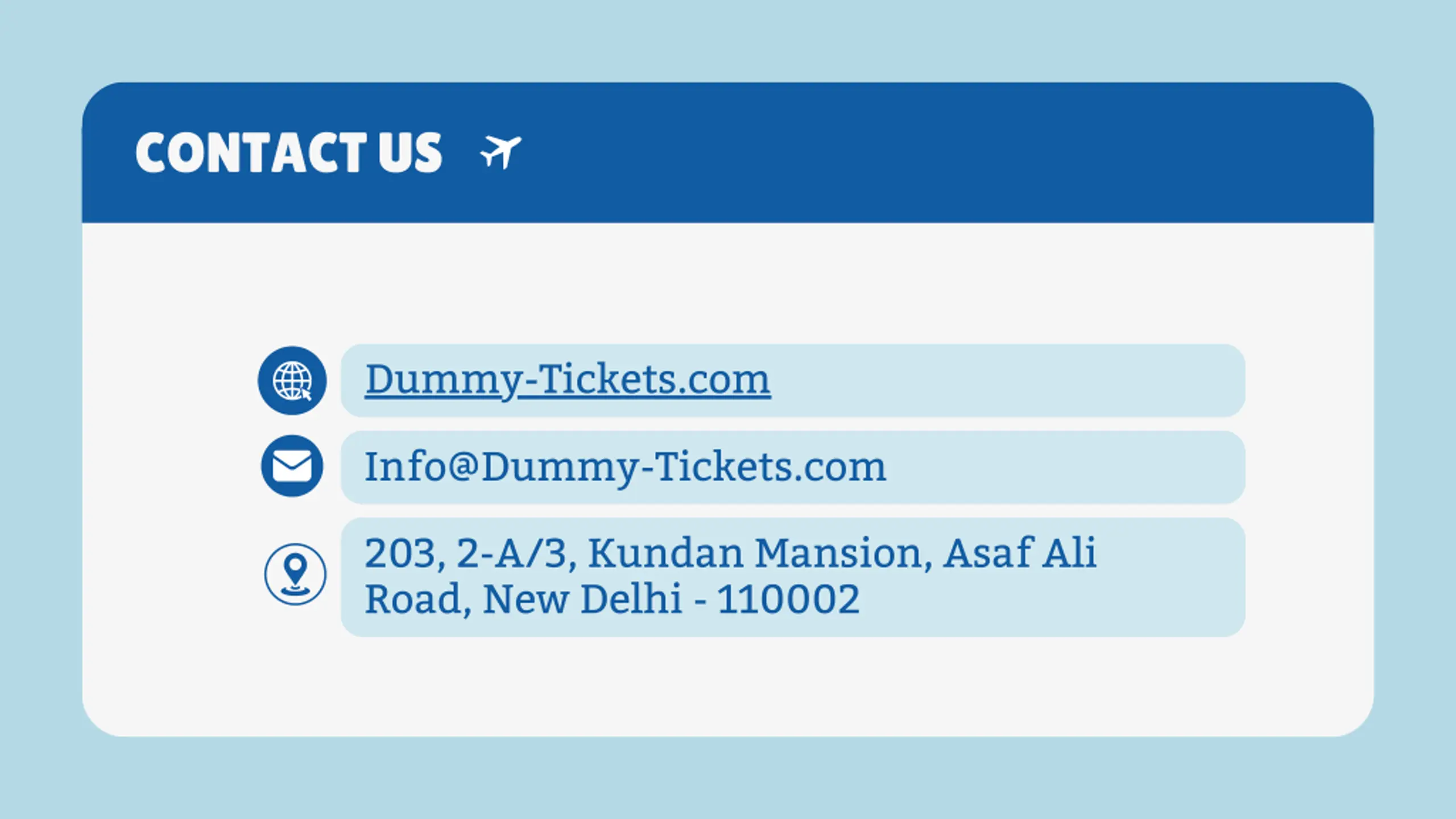 CONTACT US Dummy-Tickets.com Info@Dummy-Tickets.com 203, 2-A/3, Kundan Mansion, Asaf Ali Road, New Delhi - 110002