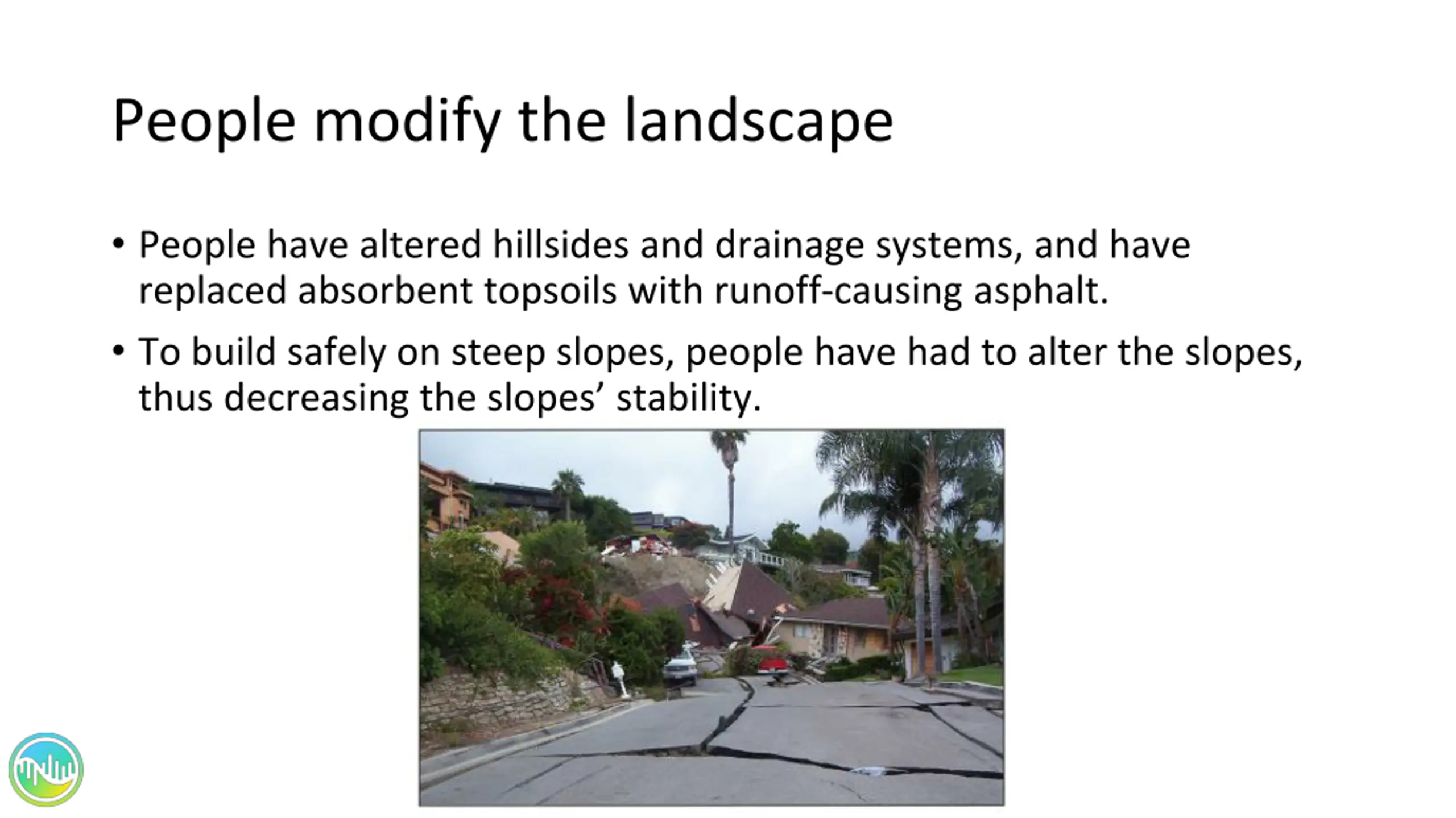 People modify the landscape People have altered hillsides and drainage systems, and have replaced absorbent topsoils with runoff-causing asphalt. To build safely on steep slopes, people have had to alter the slopes, thus decreasing the slopes stability.