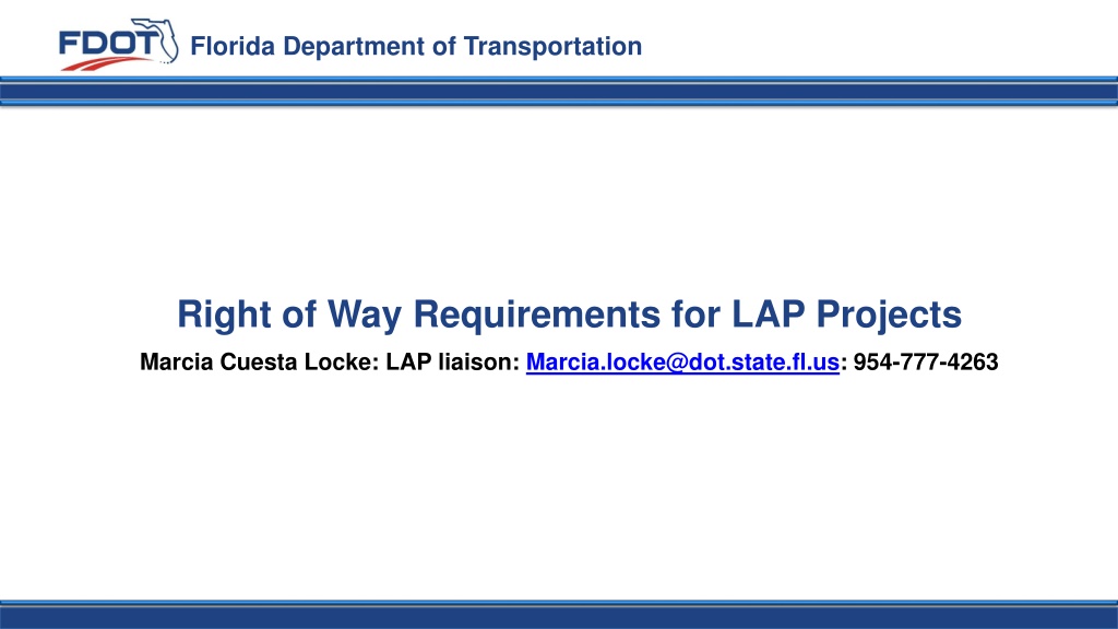 Florida Department of Transportation Right of Way Requirements for LAP Projects Marcia Cuesta Locke: LAP liaison: Marcia.locke@dot.state.fl.us: 954-777-4263