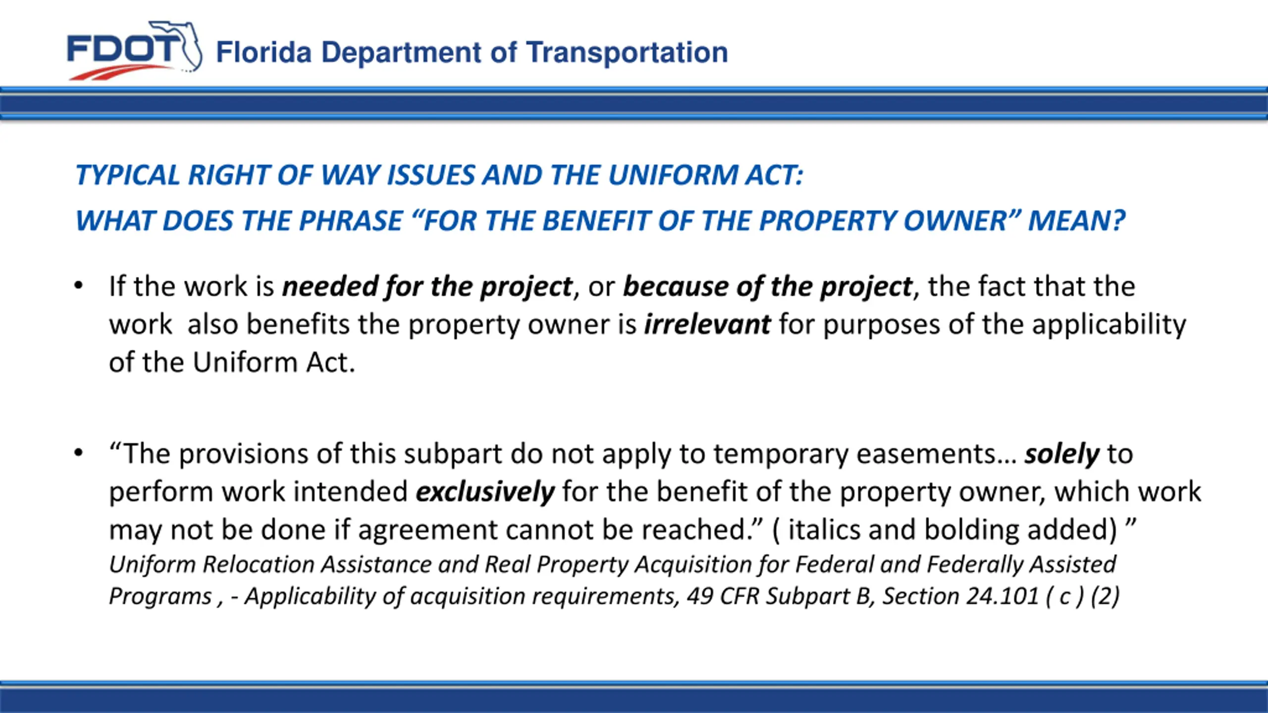 Florida Department of Transportation TYPICAL RIGHT OF WAY ISSUES AND THE UNIFORM ACT: WHAT DOES THE PHRASE FOR THE BENEFIT OF THE PROPERTY OWNER MEAN? If the work is needed for the project, or because of the project, the fact that the work also benefits the property owner is irrelevant for purposes of the applicability of the Uniform Act. The provisions of this subpart do not apply to temporary easements solely to perform work intended exclusively for the benefit of the property owner, which work may not be done if agreement cannot be reached. ( italics and bolding added) Uniform Relocation Assistance and Real Property Acquisition for Federal and Federally Assisted Programs , - Applicability of acquisition requirements, 49 CFR Subpart B, Section 24.101 ( c ) (2)