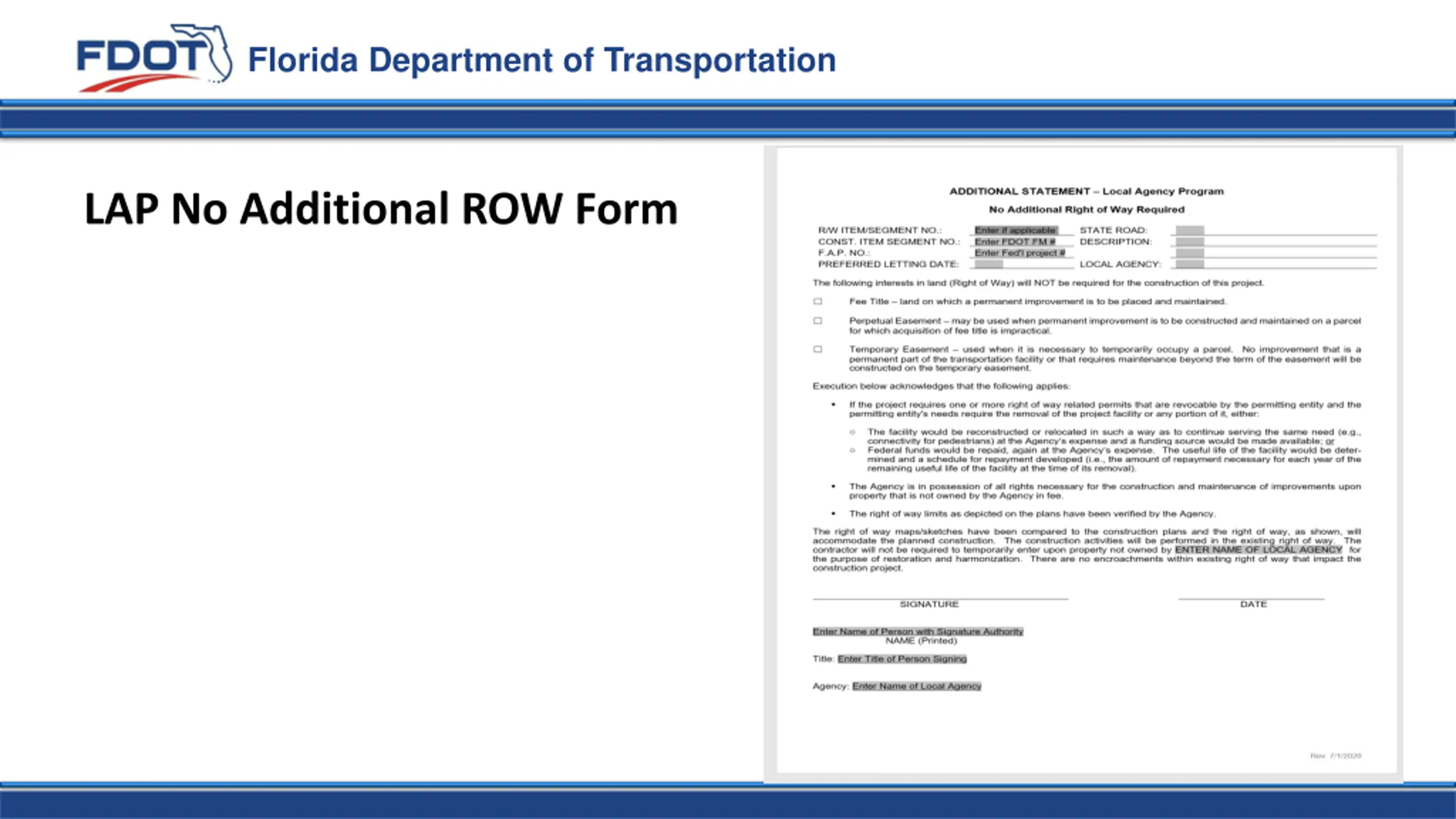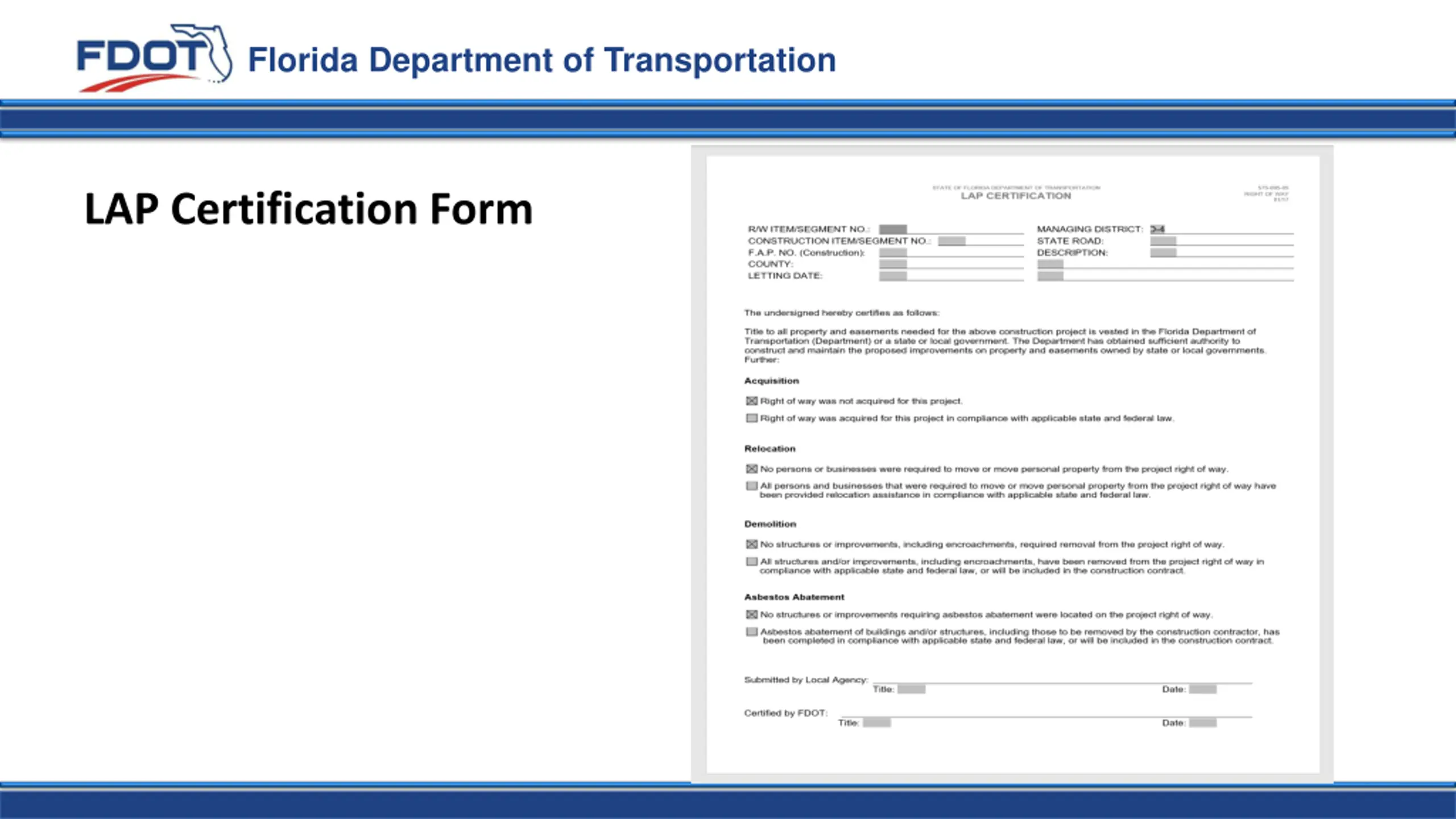 Florida Department of Transportation RIGHT OF WAY CERTIFICATION Prior to project construction The Agency must provide a LAP Certification that indicates compliance with the Uniform Act ( FDOT LAP certification form #575-095-05) The Agency must also provide an additional form entitled No Additional Right of Way The FDOT District Right of Way Manager will need to verify the information contained in both forms and sign the LAP Certification in order for the project to be authorized for construction / advertised for construction bids