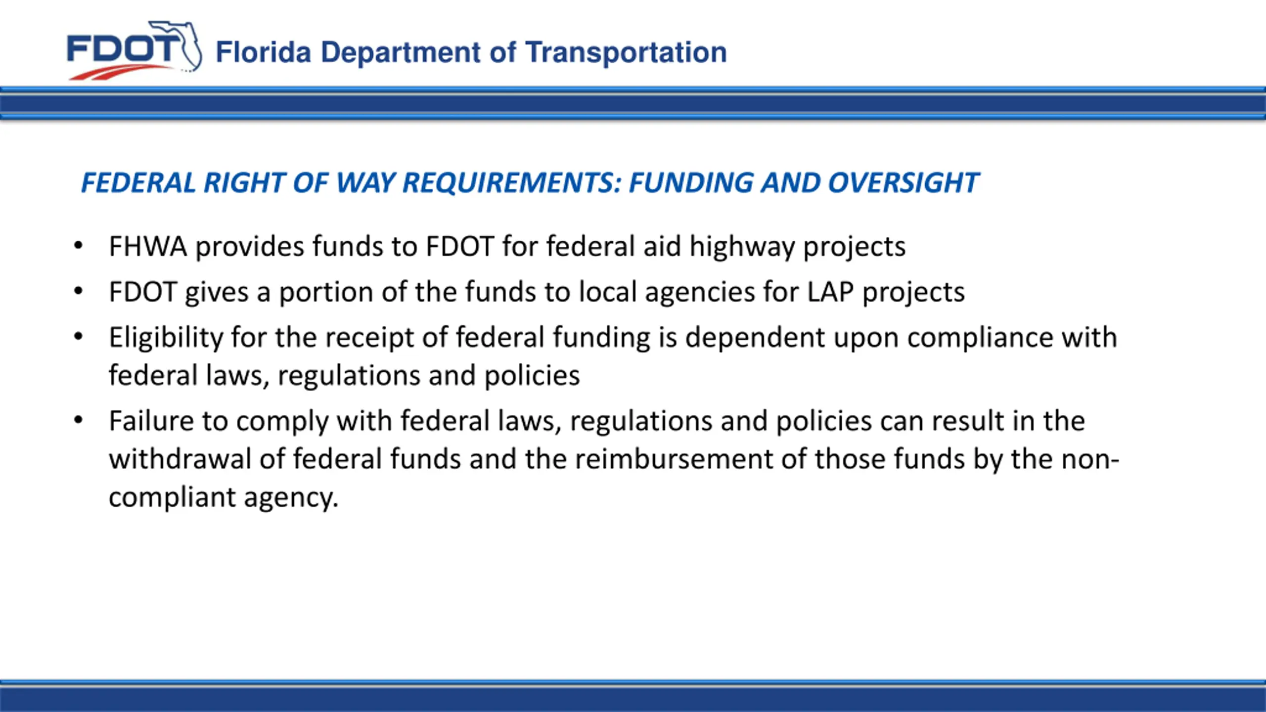 Florida Department of Transportation FEDERAL RIGHT OF WAY REQUIREMENTS: FUNDING AND OVERSIGHT FHWA provides funds to FDOT for federal aid highway projects FDOT gives a portion of the funds to local agencies for LAP projects Eligibility for the receipt of federal funding is dependent upon compliance with federal laws, regulations and policies Failure to comply with federal laws, regulations and policies can result in the withdrawal of federal funds and the reimbursement of those funds by the non- compliant agency.
