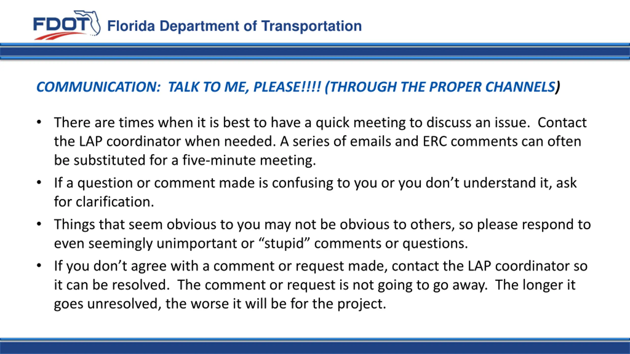 Florida Department of Transportation COMMUNICATION: TALK TO ME, PLEASE!!!! (THROUGH THE PROPER CHANNELS) There are times when it is best to have a quick meeting to discuss an issue. Contact the LAP coordinator when needed. A series of emails and ERC comments can often be substituted for a five-minute meeting. If a question or comment made is confusing to you or you don t understand it, ask for clarification. Things that seem obvious to you may not be obvious to others, so please respond to even seemingly unimportant or stupid comments or questions. If you don t agree with a comment or request made, contact the LAP coordinator so it can be resolved. The comment or request is not going to go away. The longer it goes unresolved, the worse it will be for the project.