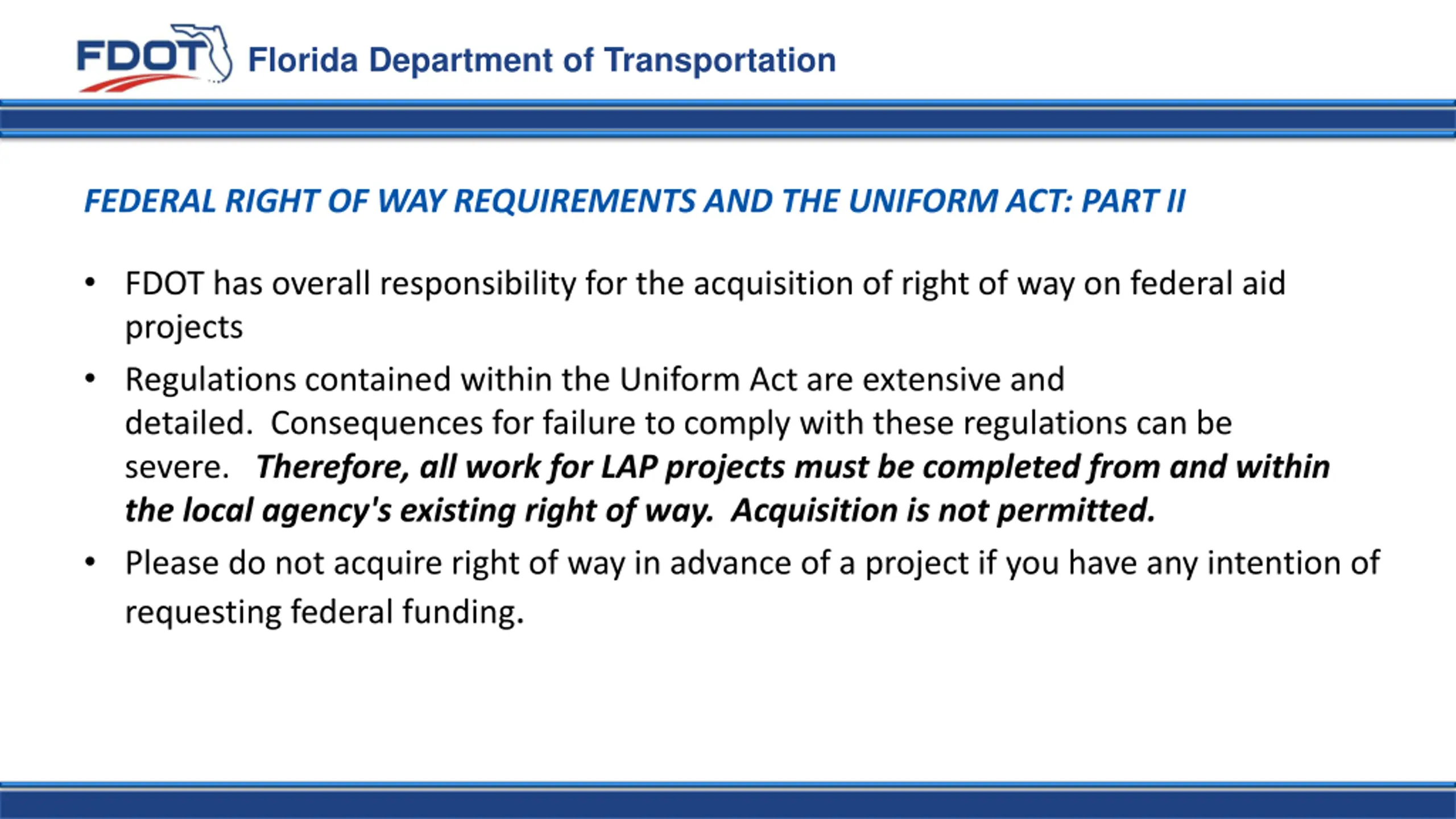Florida Department of Transportation FEDERAL RIGHT OF WAY REQUIREMENTS AND THE UNIFORM ACT: PART II FDOT has overall responsibility for the acquisition of right of way on federal aid projects Regulations contained within the Uniform Act are extensive and detailed. Consequences for failure to comply with these regulations can be severe. Therefore, all work for LAP projects must be completed from and within the local agency's existing right of way. Acquisition is not permitted. Please do not acquire right of way in advance of a project if you have any intention of requesting federal funding.
