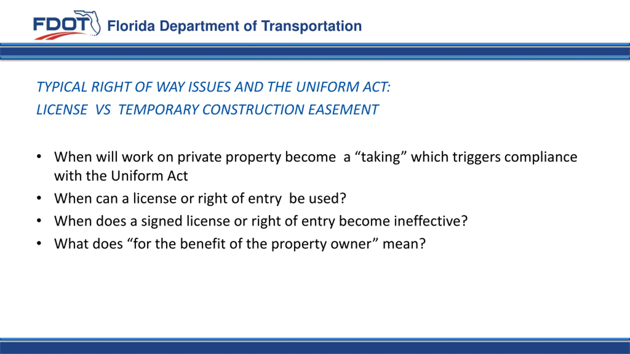 Florida Department of Transportation TYPICAL RIGHT OF WAY ISSUES AND THE UNIFORM ACT: LICENSE VS TEMPORARY CONSTRUCTION EASEMENT When will work on private property become a taking which triggers compliance with the Uniform Act When can a license or right of entry be used? When does a signed license or right of entry become ineffective? What does for the benefit of the property owner mean?