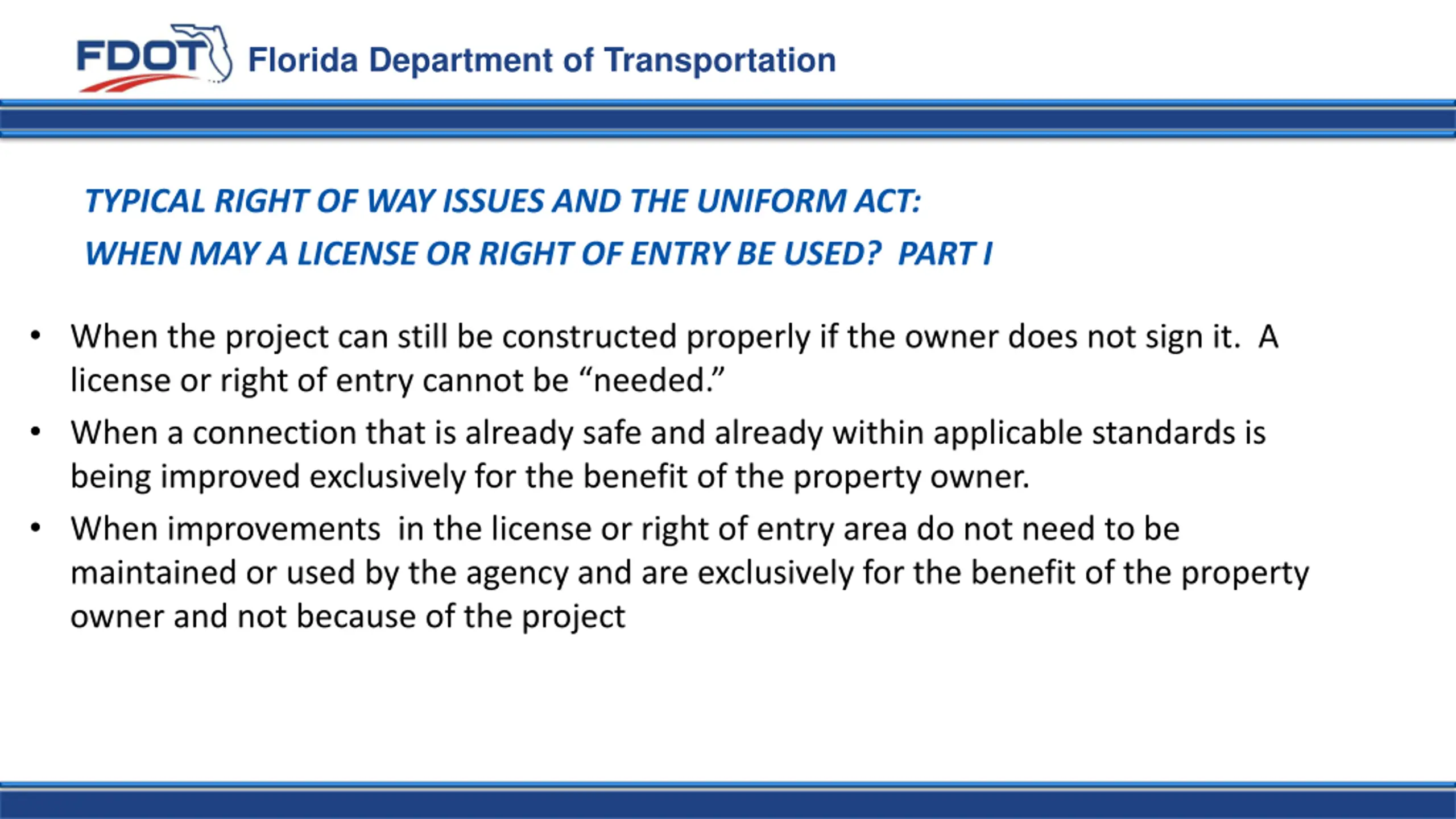 Florida Department of Transportation TYPICAL RIGHT OF WAY ISSUES AND THE UNIFORM ACT: WHEN MAY A LICENSE OR RIGHT OF ENTRY BE USED? PART I When the project can still be constructed properly if the owner does not sign it. A license or right of entry cannot be needed. When a connection that is already safe and already within applicable standards is being improved exclusively for the benefit of the property owner. When improvements in the license or right of entry area do not need to be maintained or used by the agency and are exclusively for the benefit of the property owner and not because of the project