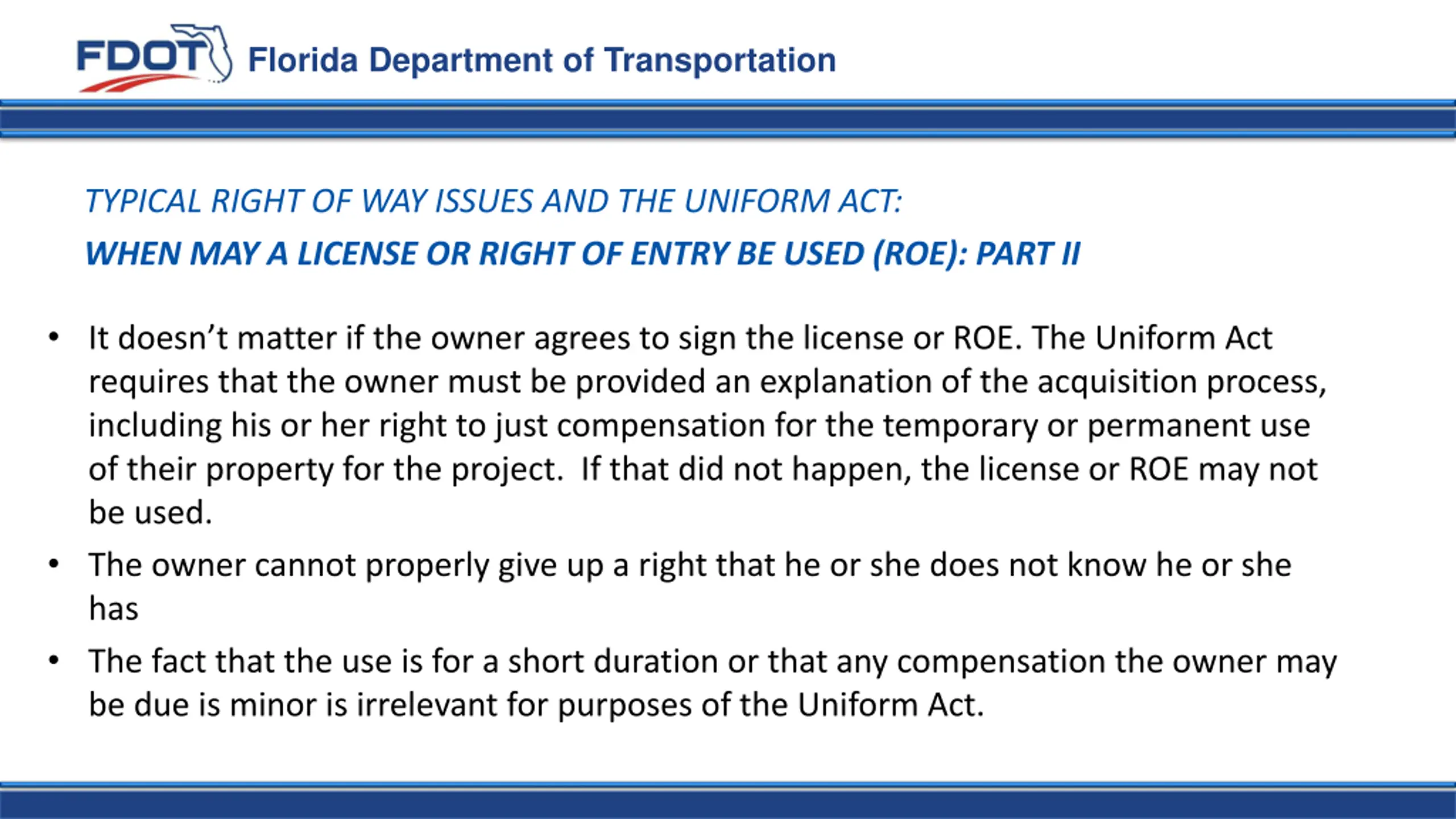 Florida Department of Transportation TYPICAL RIGHT OF WAY ISSUES AND THE UNIFORM ACT: WHEN MAY A LICENSE OR RIGHT OF ENTRY BE USED (ROE): PART II It doesn t matter if the owner agrees to sign the license or ROE. The Uniform Act requires that the owner must be provided an explanation of the acquisition process, including his or her right to just compensation for the temporary or permanent use of their property for the project. If that did not happen, the license or ROE may not be used. The owner cannot properly give up a right that he or she does not know he or she has The fact that the use is for a short duration or that any compensation the owner may be due is minor is irrelevant for purposes of the Uniform Act.