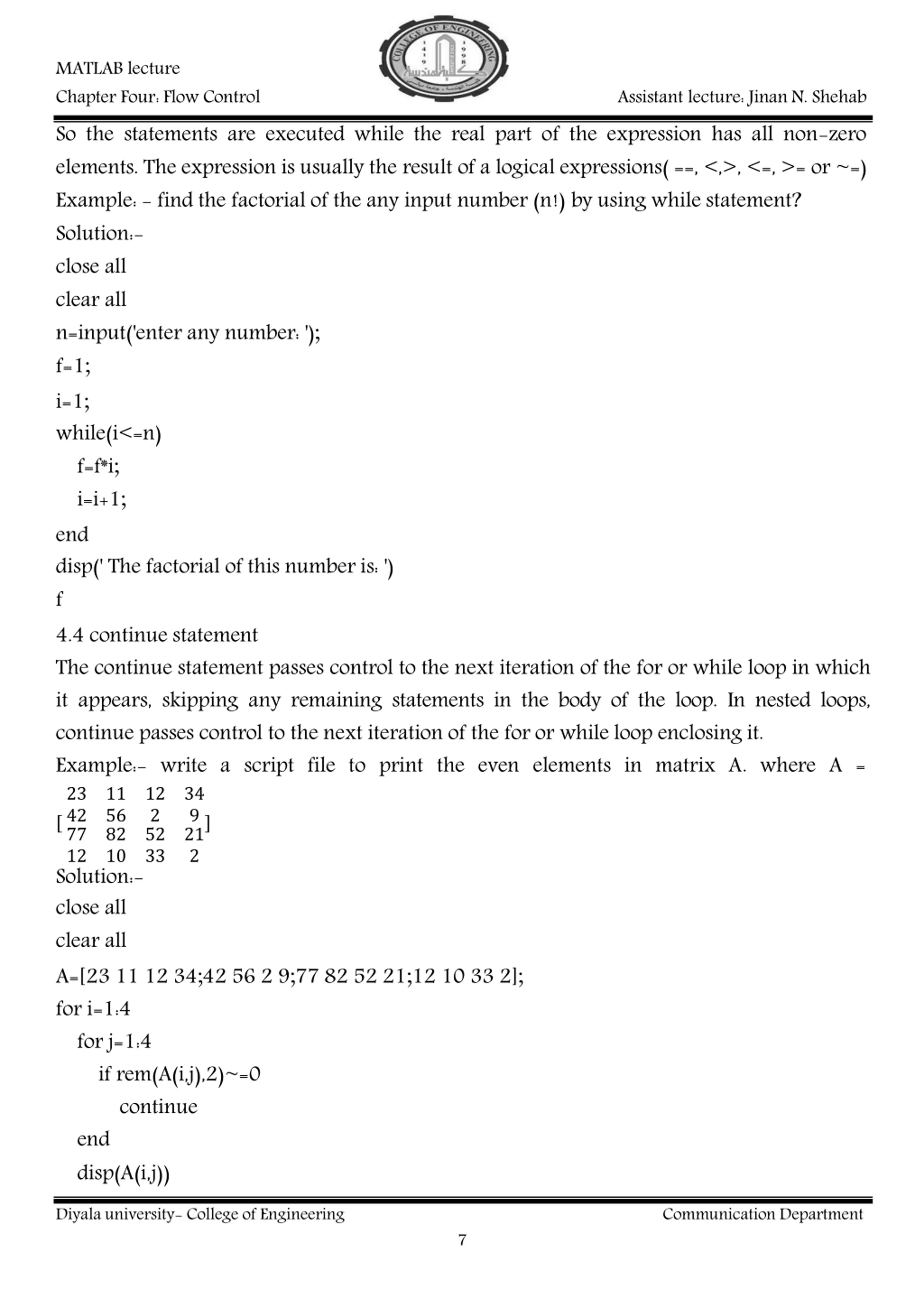 MATLAB lecture Chapter Four: Flow Control So the statements are executed while the real part of the expression has all non-zero elements. The expression is usually the result of a logical expressions( ==, <,>, <=, >= or ~=) Example: - find the factorial of the any input number (n!) by using while statement? Solution:- close all clear all n=input('enter any number: '); f=1; i=1; while(i<=n) f=f*i; i=i+1; end disp(' The factorial of this number is: ') f 4.4 continue statement The continue statement passes control to the next iteration of the for or while loop in which it appears, skipping any remaining statements in the body of the loop. In nested loops, continue passes control to the next iteration of the for or while loop enclosing it. Example:- write a script file to print the even elements in matrix A. where A = 23 11 12 34 [ 42 56 2 9] 77 82 52 21 12 10 33 2 Solution:- close all clear all A=[23 11 12 34;42 56 2 9;77 82 52 21;12 10 33 2]; for i=1:4 for j=1:4 if rem(A(i,j),2)~=0 continue end disp(A(i,j)) Assistant lecture: Jinan N. Shehab Diyala university- College of Engineering Communication Department 7