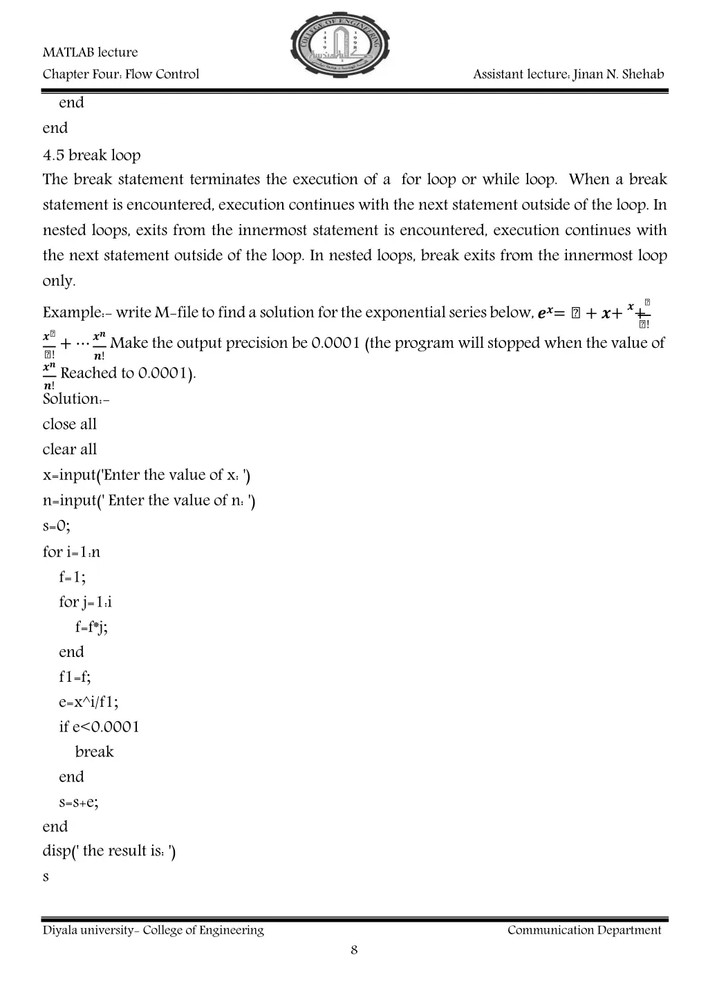 MATLAB lecture Chapter Four: Flow Control end end 4.5 break loop The break statement terminates the execution of a for loop or while loop. When a break statement is encountered, execution continues with the next statement outside of the loop. In nested loops, exits from the innermost statement is encountered, execution continues with the next statement outside of the loop. In nested loops, break exits from the innermost loop only. Example:-writeM-fileto findasolutionforthe exponentialseriesbelow,??= + ?+?+ Make the output precision be 0.0001 (the program willstopped when the value of ! ?? Reached to 0.0001). Solution:- close all clear all x=input('Enter the value of x: ') n=input(' Enter the value of n: ') s=0; for i=1:n f=1; for j=1:i f=f*j; end f1=f; e=x^i/f1; if e<0.0001 break end s=s+e; end disp(' the result is: ') s Assistant lecture: Jinan N. Shehab ! ? + ?? ?! ?! Diyala university- College of Engineering Communication Department 8