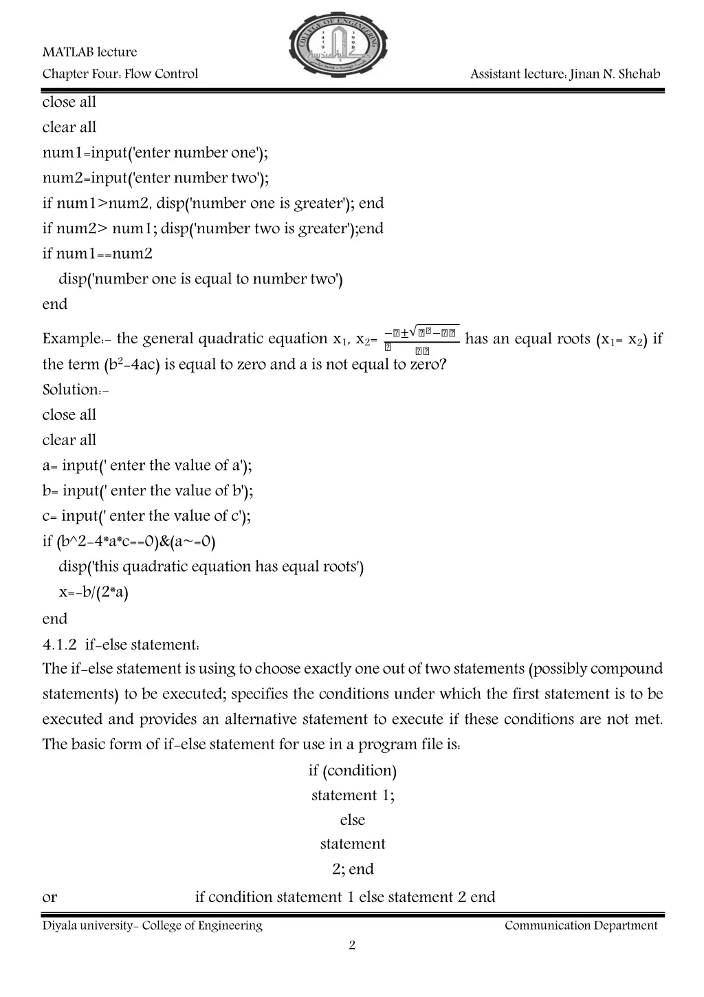 MATLAB lecture Chapter Four: Flow Control close all clear all num1=input('enter number one'); num2=input('enter number two'); if num1>num2, disp('number one is greater'); end if num2> num1; disp('number two is greater');end if num1==num2 disp('number one is equal to number two') end Assistant lecture: Jinan N. Shehab Example:- the general quadratic equation x1, x2= the term (b2-4ac) is equal to zero and a is not equal to zero? Solution:- close all clear all a= input(' enter the value of a'); b= input(' enter the value of b'); c= input(' enter the value of c'); if (b^2-4*a*c==0)&(a~=0) disp('this quadratic equation has equal roots') x=-b/(2*a) end 4.1.2 if-else statement: Theif-elsestatementisusing tochoose exactly oneoutoftwostatements (possiblycompound statements) to be executed; specifies the conditions under which the first statement is to be executed and provides an alternative statement to execute if these conditions are not met. The basic form of if-else statement for use in a program file is: if (condition) statement 1; else statement 2; end has an equal roots (x1= x2) if or Diyala university- College of Engineering if condition statement 1 else statement 2 end Communication Department 2