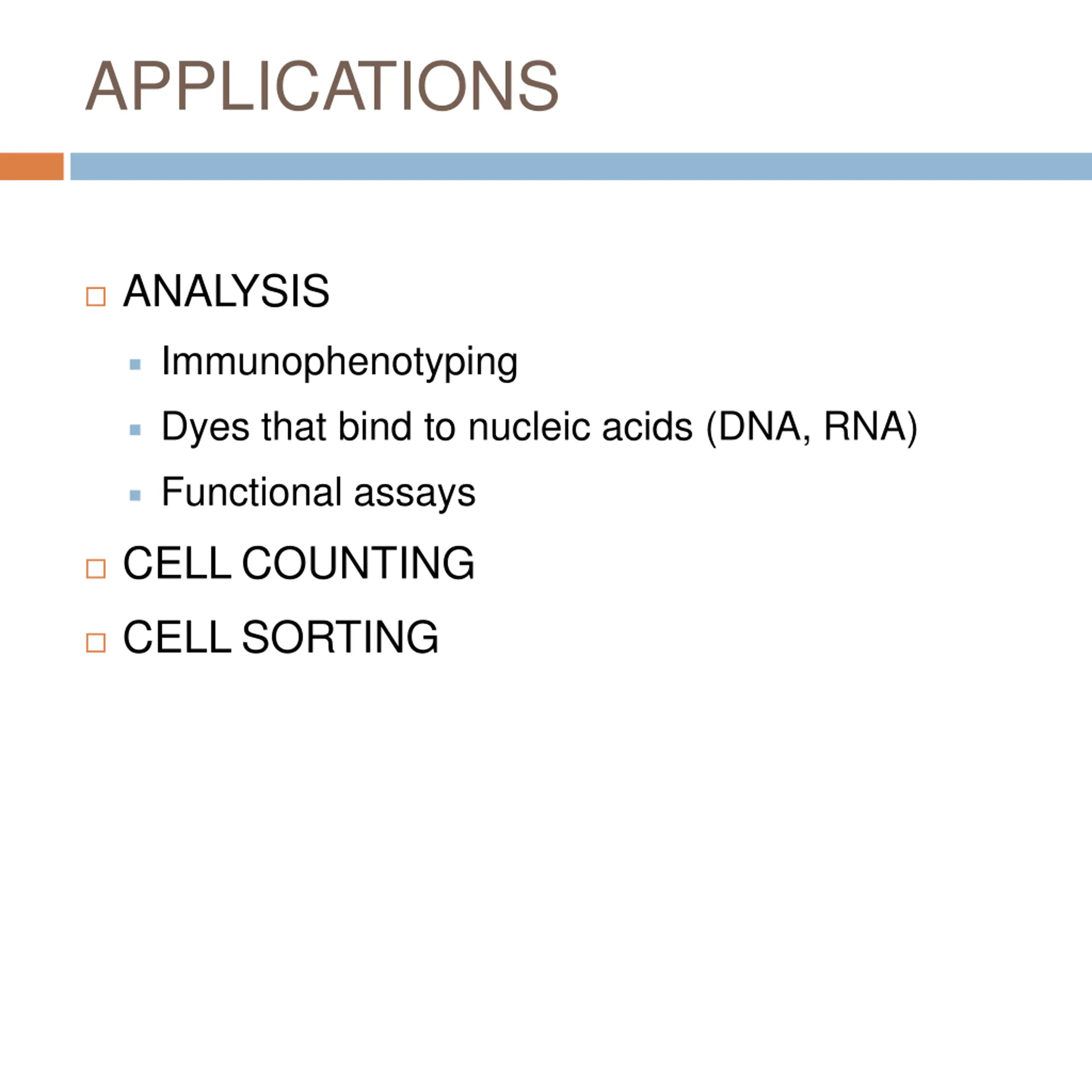 APPLICATIONS ANALYSIS Immunophenotyping Dyes that bind to nucleic acids (DNA, RNA) Functional assays CELLCOUNTING CELLSORTING