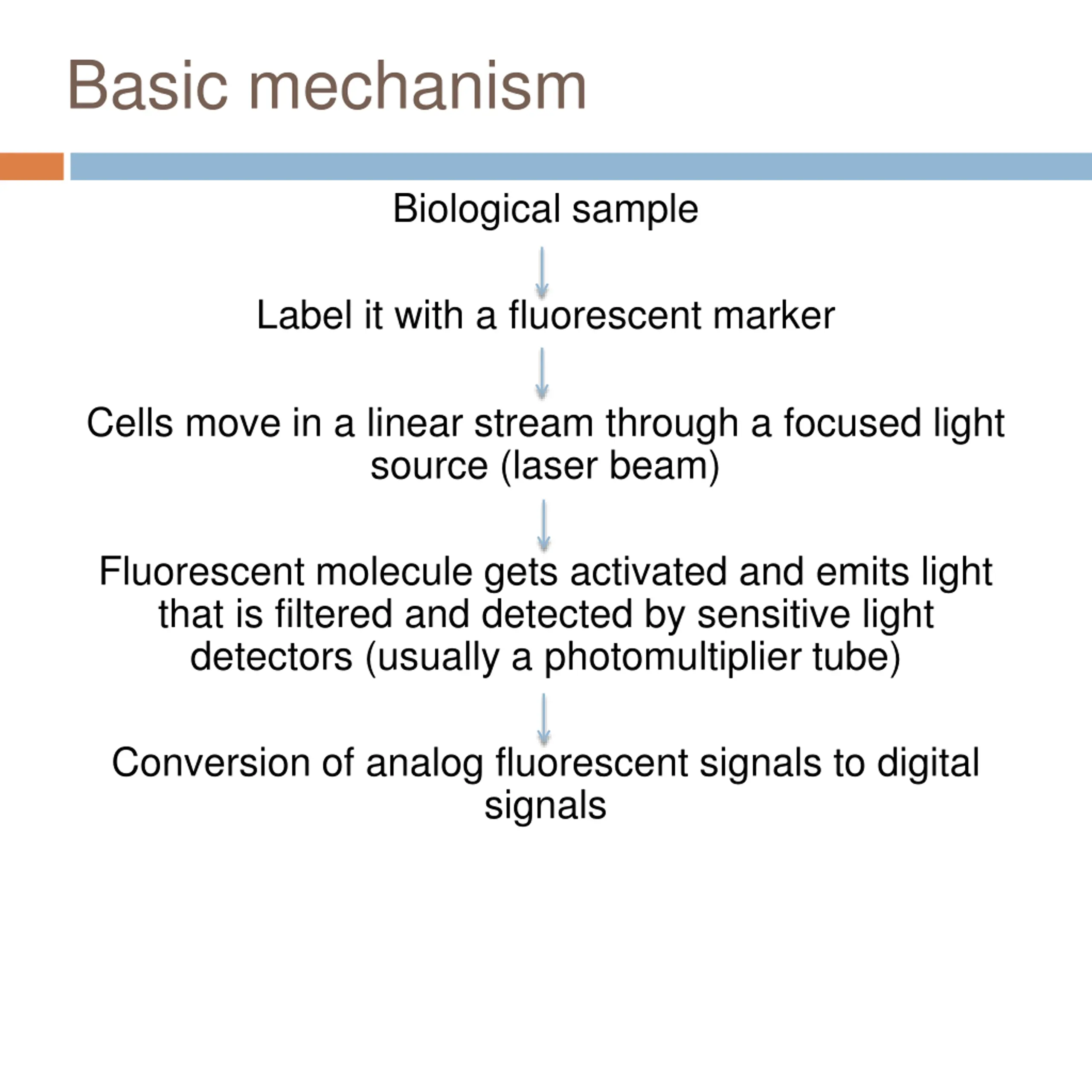 Basic mechanism Biological sample Label it with a fluorescent marker Cells move in a linear stream through a focused light source (laser beam) Fluorescent molecule gets activated and emits light that is filtered and detected by sensitive light detectors (usually a photomultiplier tube) Conversion of analog fluorescent signals to digital signals