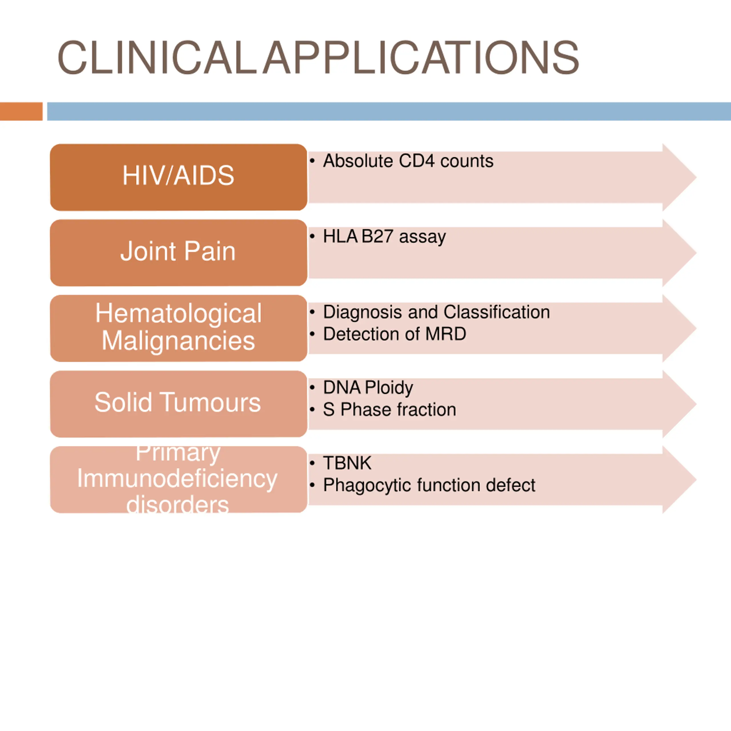 CLINICALAPPLICATIONS Absolute CD4 counts HIV/AIDS HLAB27 assay Joint Pain Hematological Malignancies Diagnosis and Classification Detection of MRD DNAPloidy S Phase fraction Solid Tumours Primary TBNK Phagocytic function defect Immunodeficiency disorders