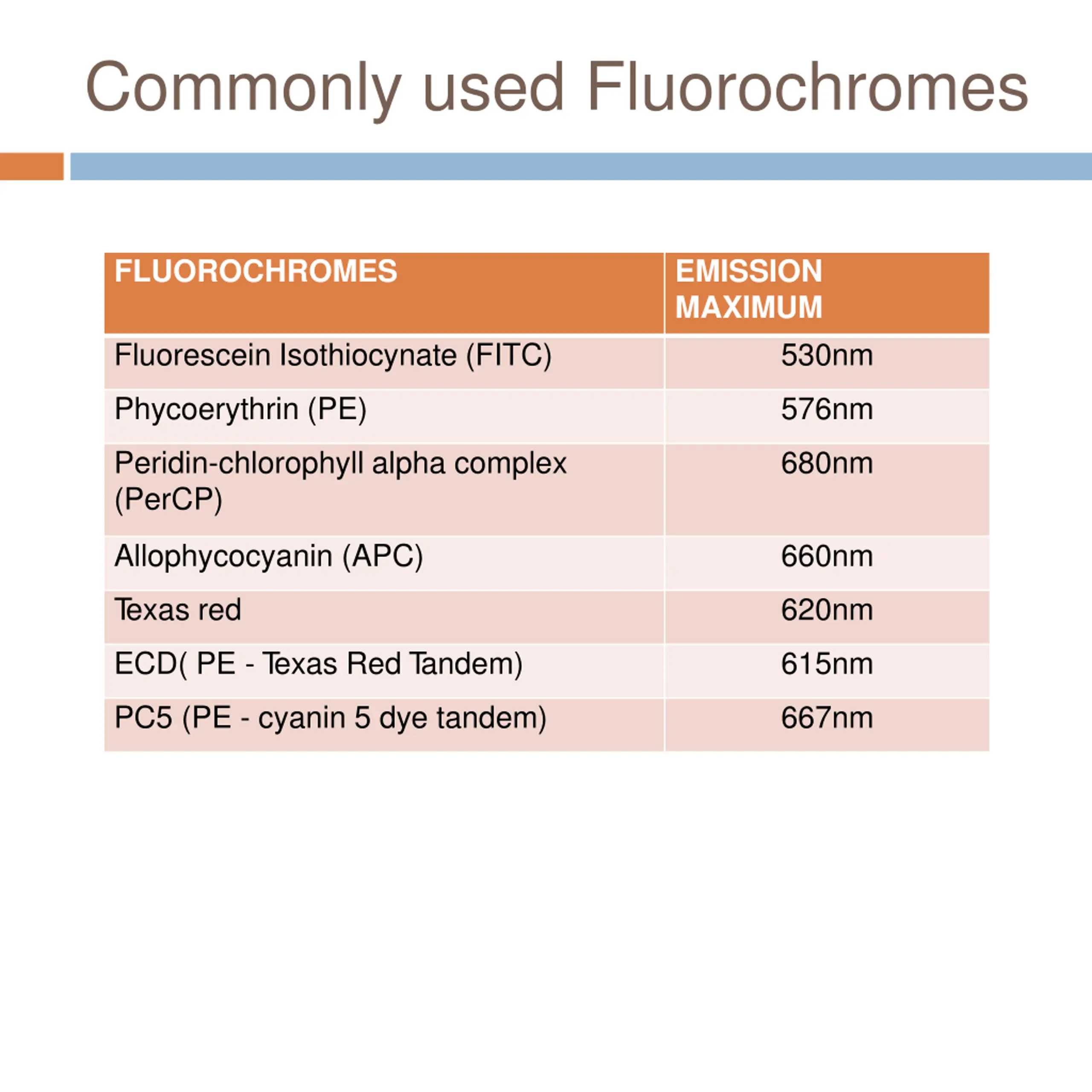 Commonly used Fluorochromes FLUOROCHROMES EMISSION MAXIMUM Fluorescein Isothiocynate (FITC) 530nm Phycoerythrin (PE) 576nm Peridin-chlorophyll alpha complex (PerCP) 680nm Allophycocyanin (APC) 660nm T exas red 620nm ECD( PE - T exas Red T andem) 615nm PC5 (PE - cyanin 5 dye tandem) 667nm