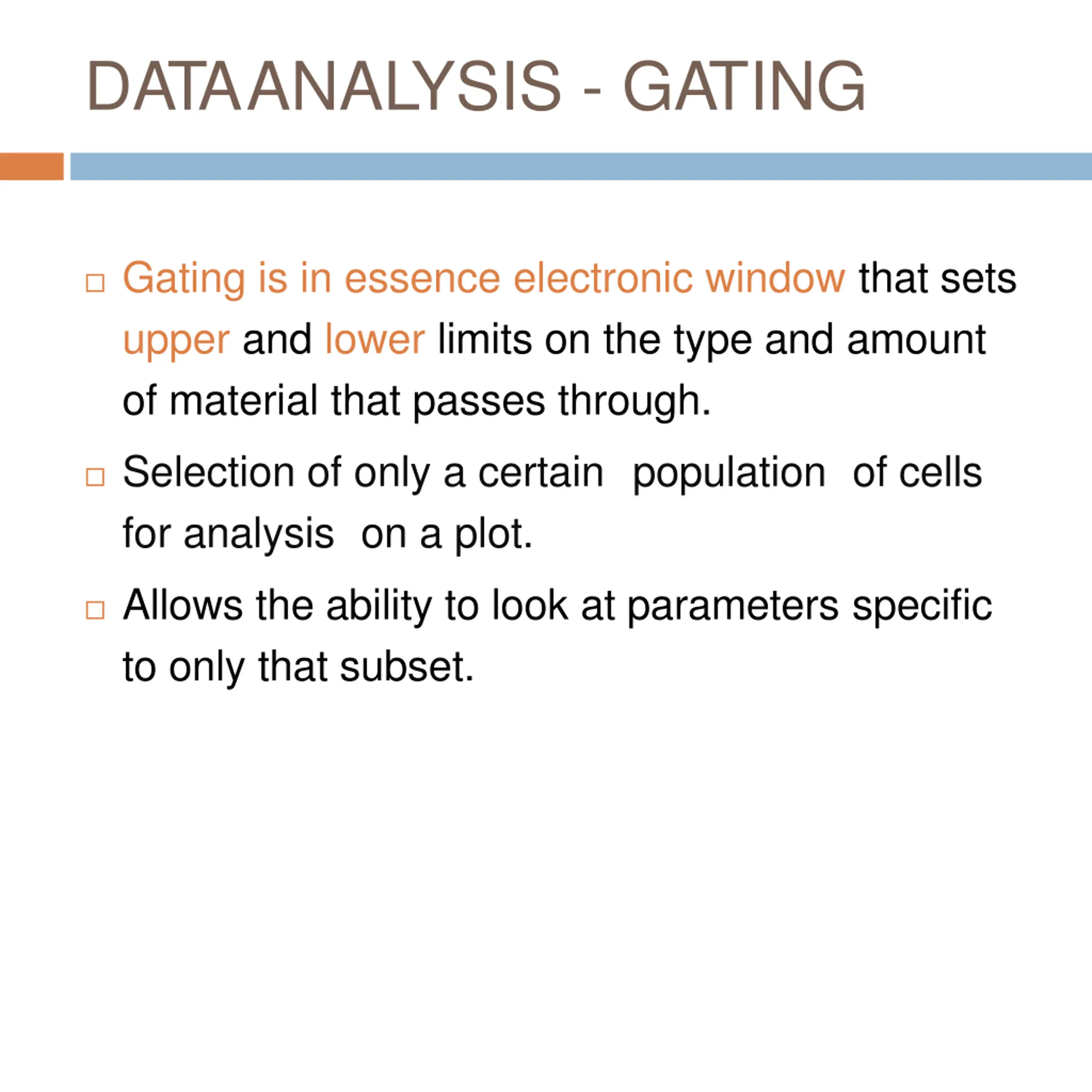 DATAANALYSIS - GATING Gating is in essence electronic window that sets upper and lower limits on the type and amount of material that passes through. Selection of only a certain population of cells for analysis on a plot. Allows the ability to look at parameters specific to only that subset.