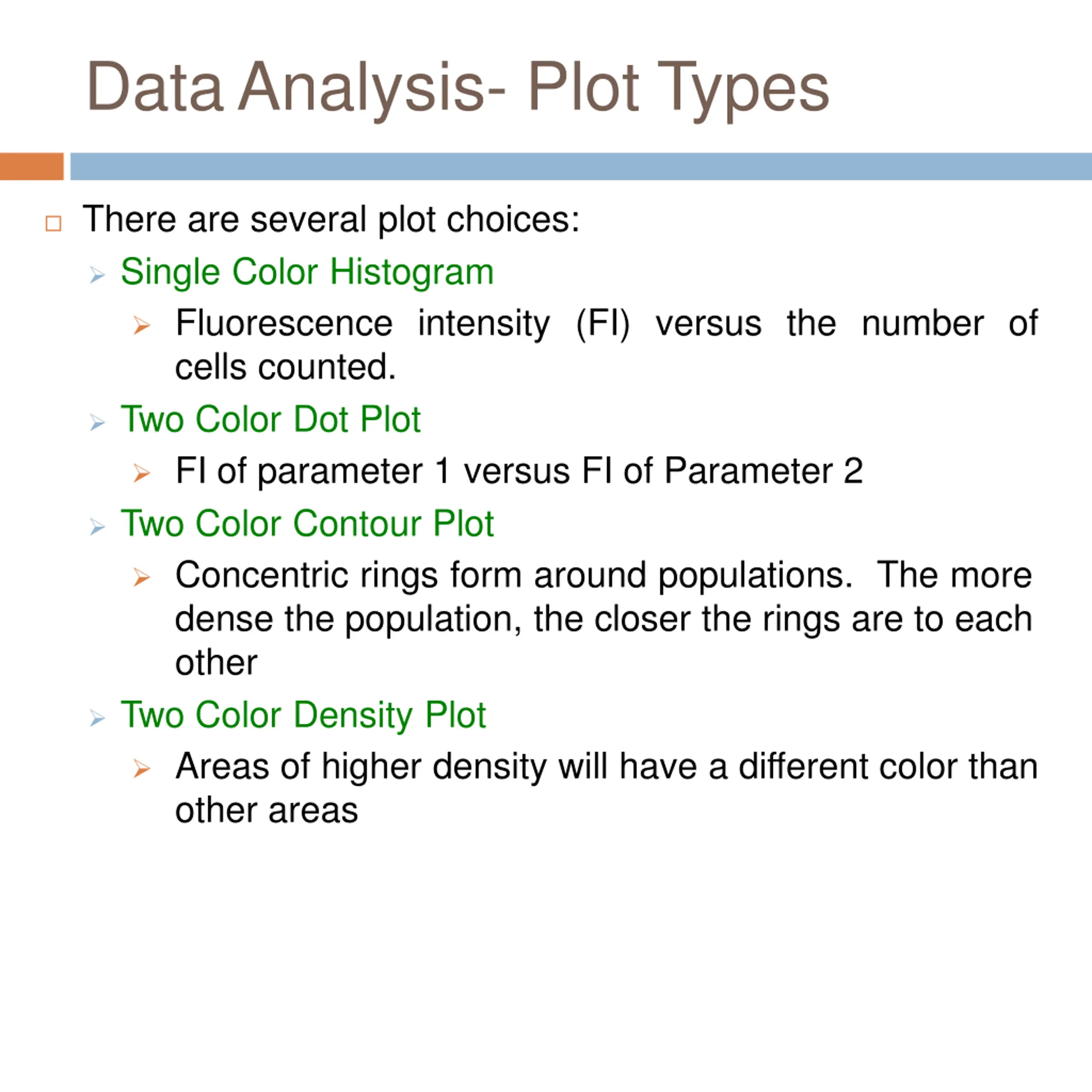 DataAnalysis- Plot Types There are several plot choices: Single Color Histogram Fluorescence intensity (FI) versus the number of cells counted. Two Color Dot Plot FI of parameter 1 versus FI of Parameter 2 Two Color Contour Plot Concentric rings form around populations. The more dense the population, the closer the rings are to each other Two Color Density Plot Areas of higher density will have a different color than other areas