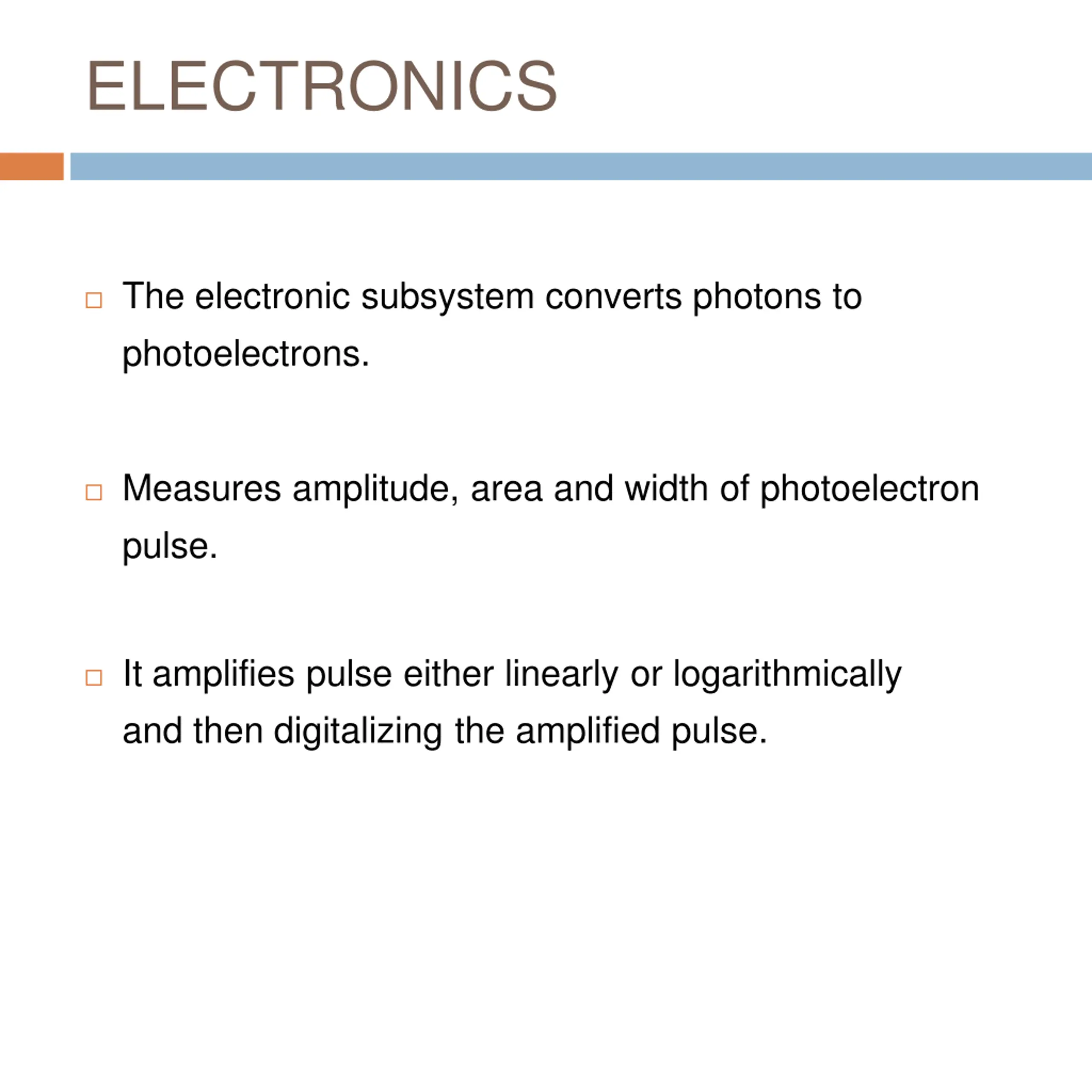 ELECTRONICS The electronic subsystem converts photons to photoelectrons. Measures amplitude, area and width of photoelectron pulse. It amplifies pulse either linearly or logarithmically and then digitalizing the amplified pulse.