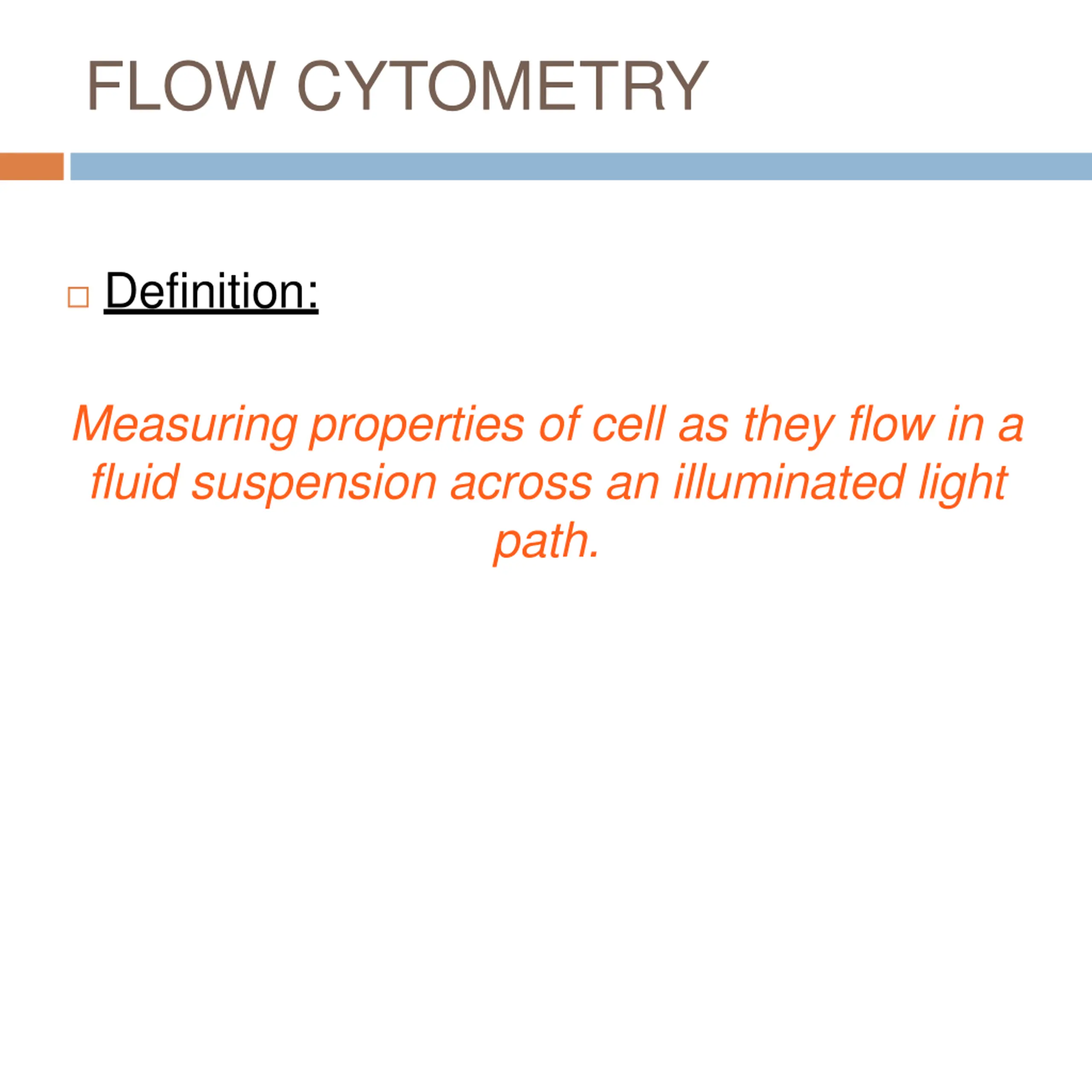 FLOW CYTOMETRY Definition: Measuring properties of cell as they flow in a fluid suspension across an illuminated light path.