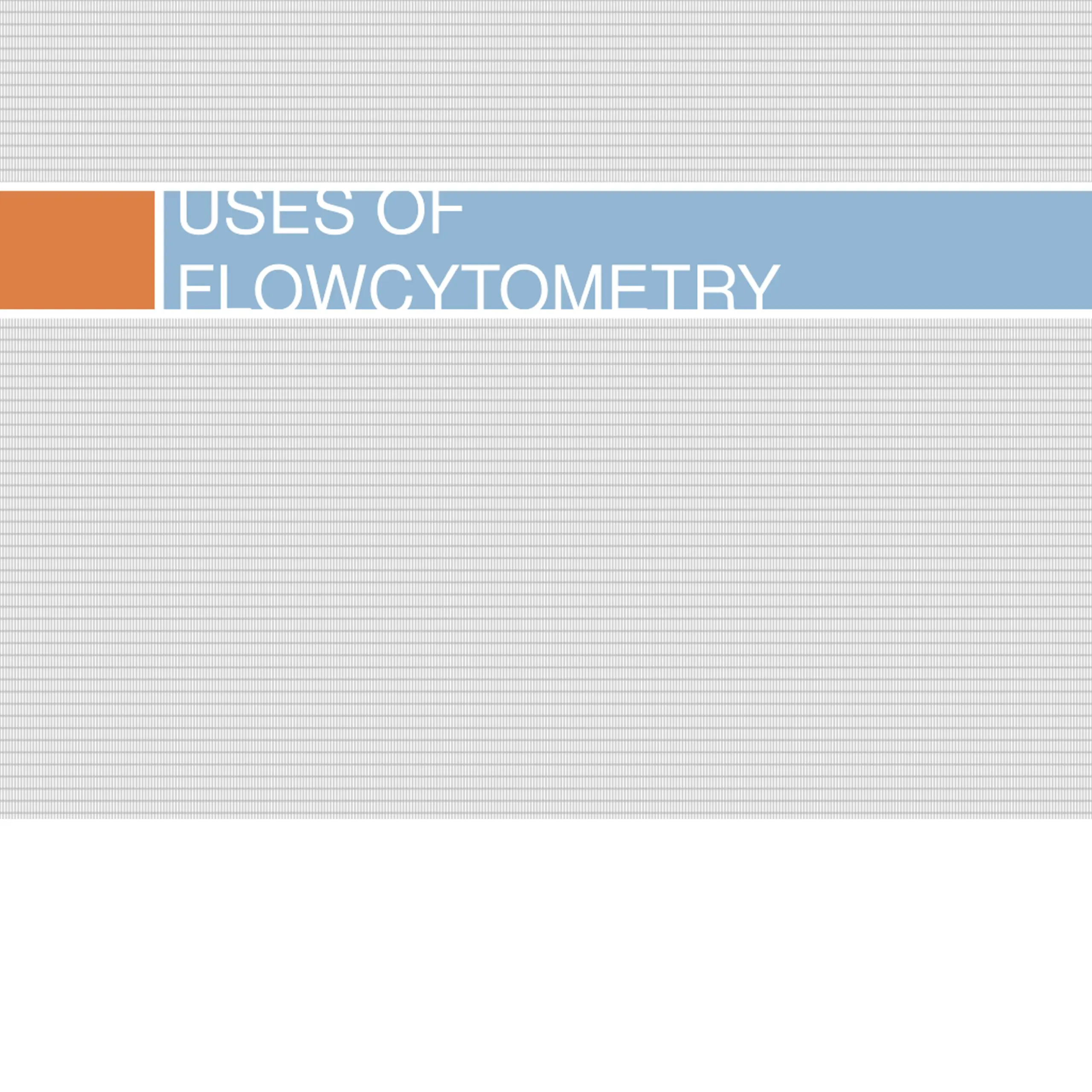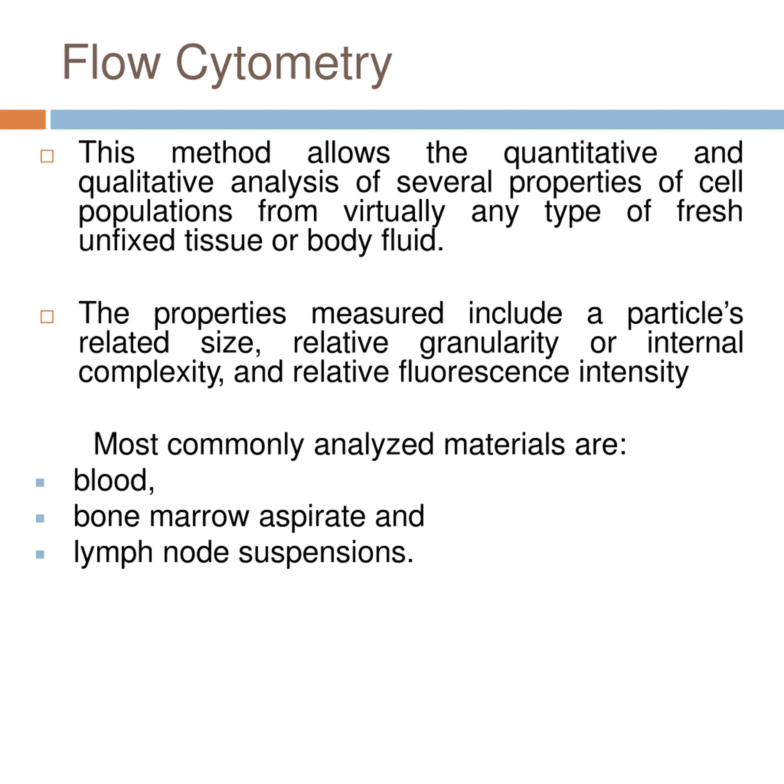 Flow Cytometry This qualitative analysis of several properties of cell populations from virtually any type of fresh unfixed tissue or body fluid. method allows the quantitative and The properties measured include a particle s related size, relative complexity, and relative fluorescence intensity granularity or internal Most commonly analyzed materials are: blood, bone marrow aspirate and lymph node suspensions.