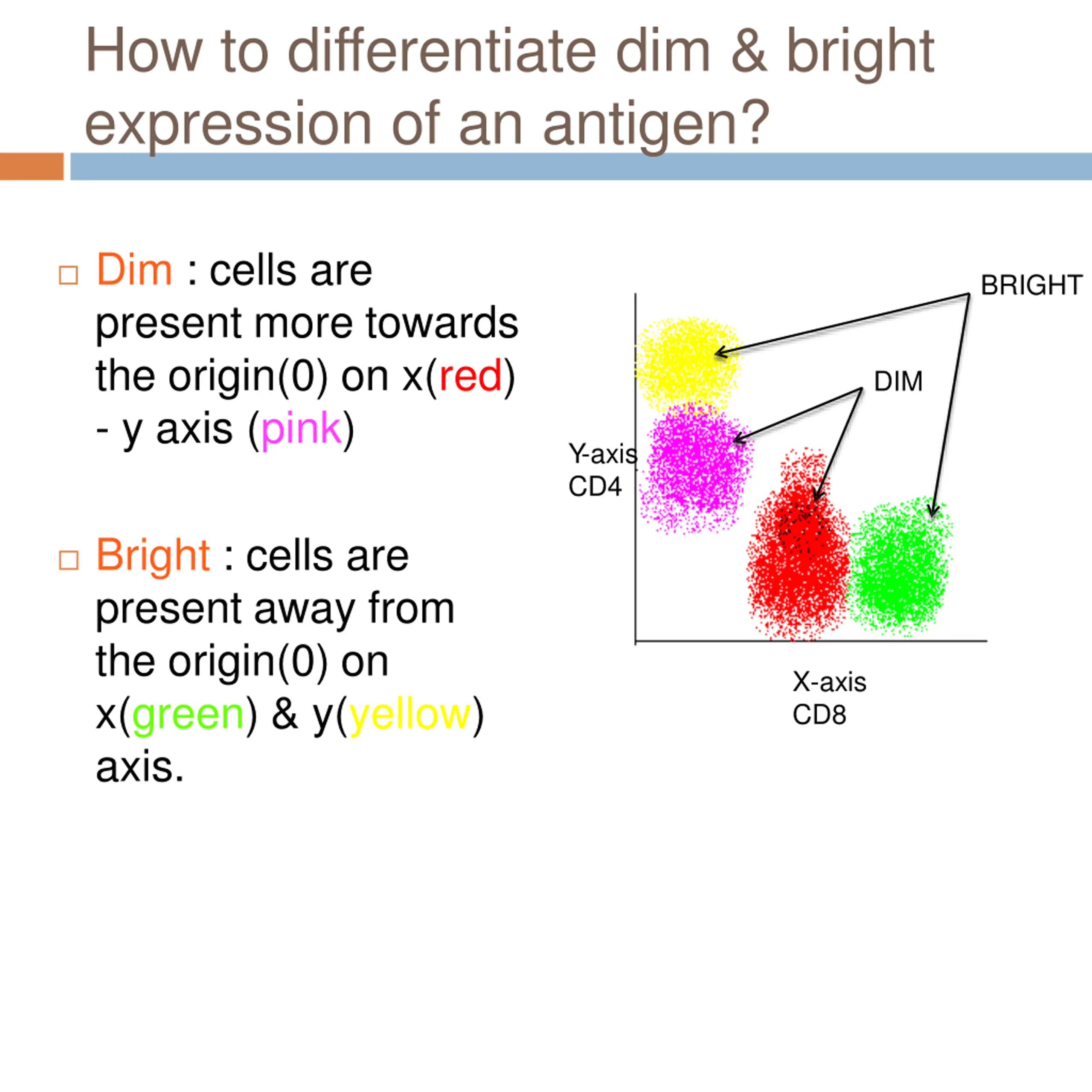 How to differentiate dim & bright expression of an antigen? Dim : cells are present more towards the origin(0) on x(red) - y axis (pink) BRIGHT DIM Y-axis CD4 Bright : cells are present away from the origin(0) on x(green) & y(yellow) axis. X-axis CD8