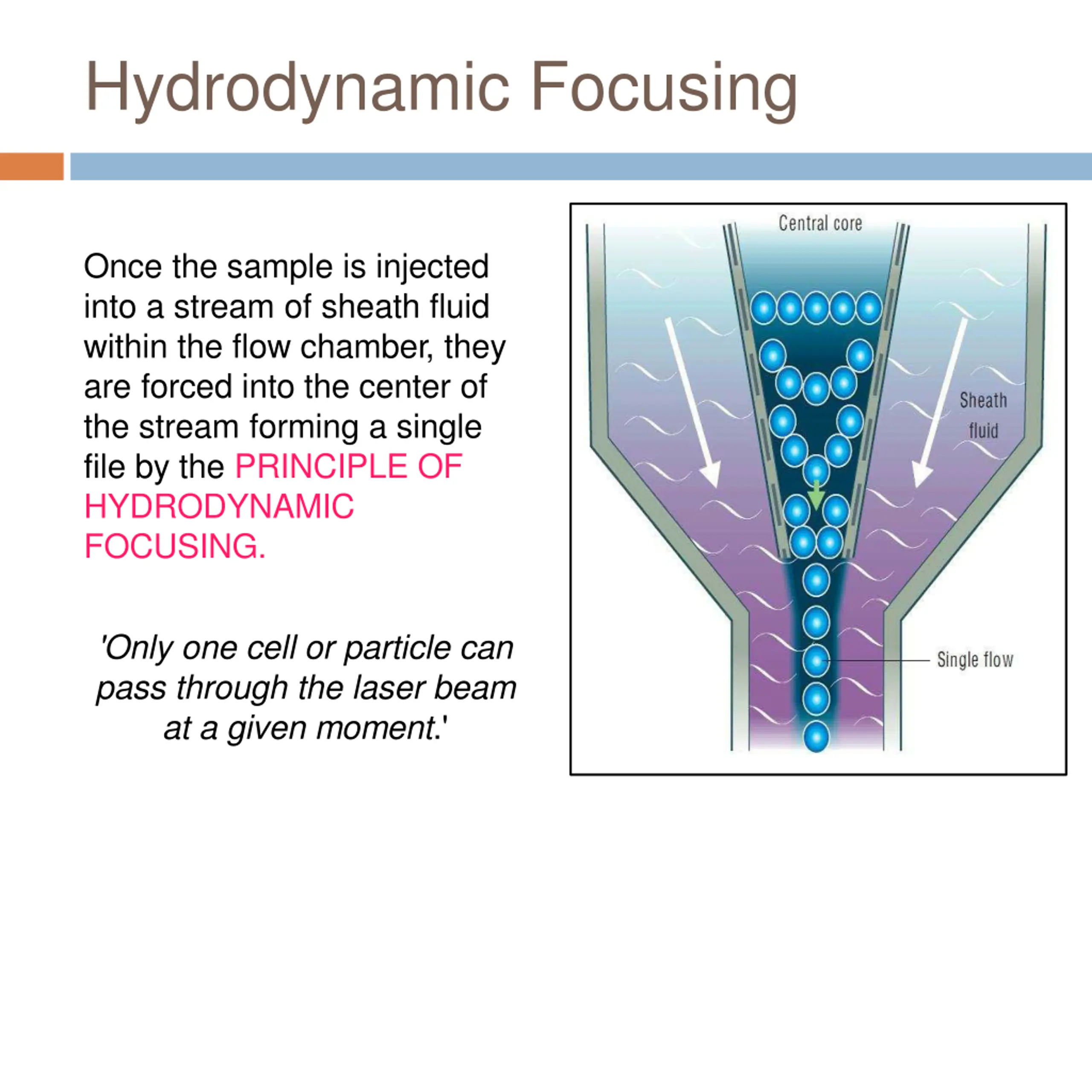 Hydrodynamic Focusing Once the sample is injected into a stream of sheath fluid within the flow chamber, they are forced into the center of the stream forming a single file by the PRINCIPLE OF HYDRODYNAMIC FOCUSING. 'Only one cell or particle can pass through the laser beam at a given moment.'