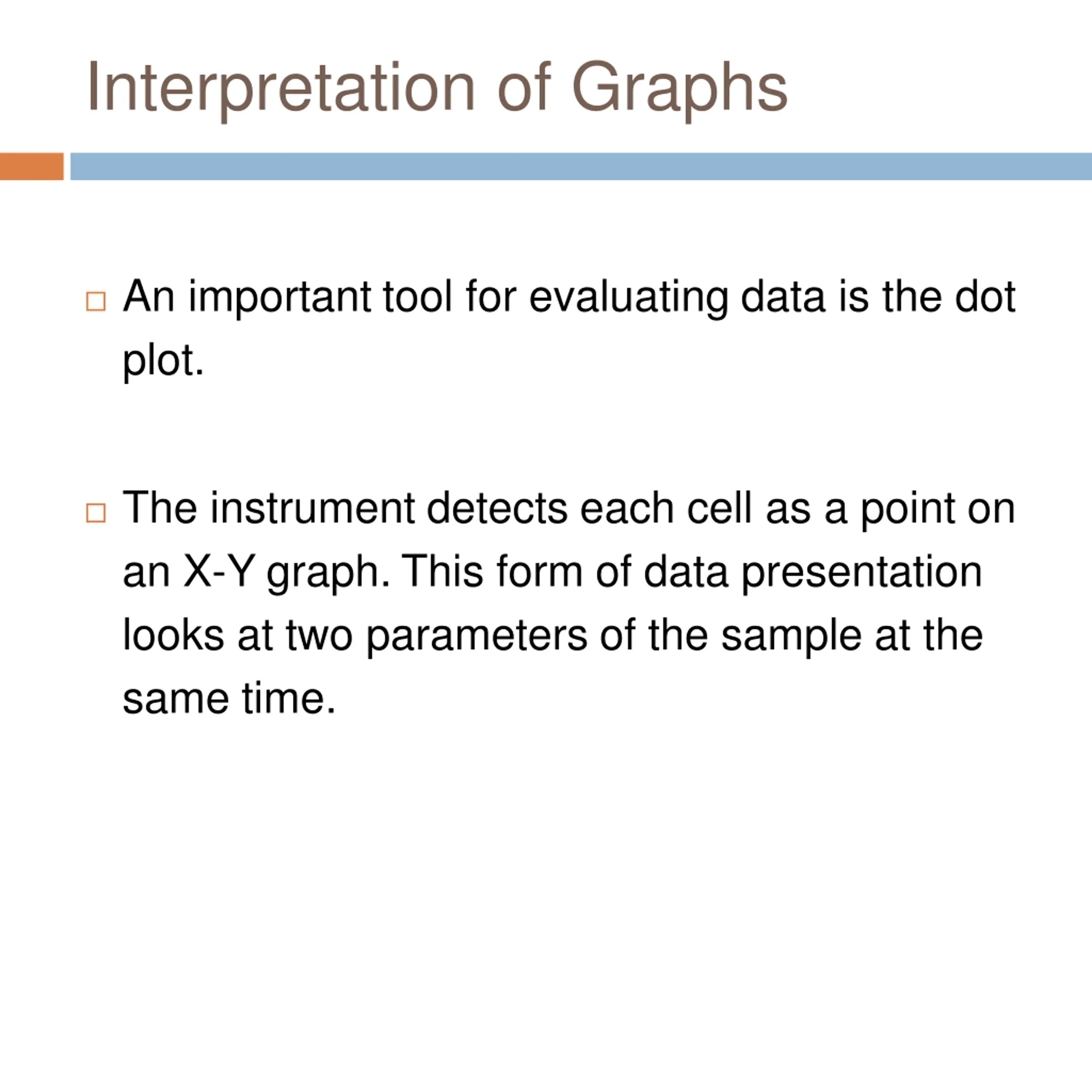 Interpretation of Graphs An important tool for evaluating data is the dot plot. The instrument detects each cell as a point on an X-Y graph. This form of data presentation looks at two parameters of the sample at the same time.