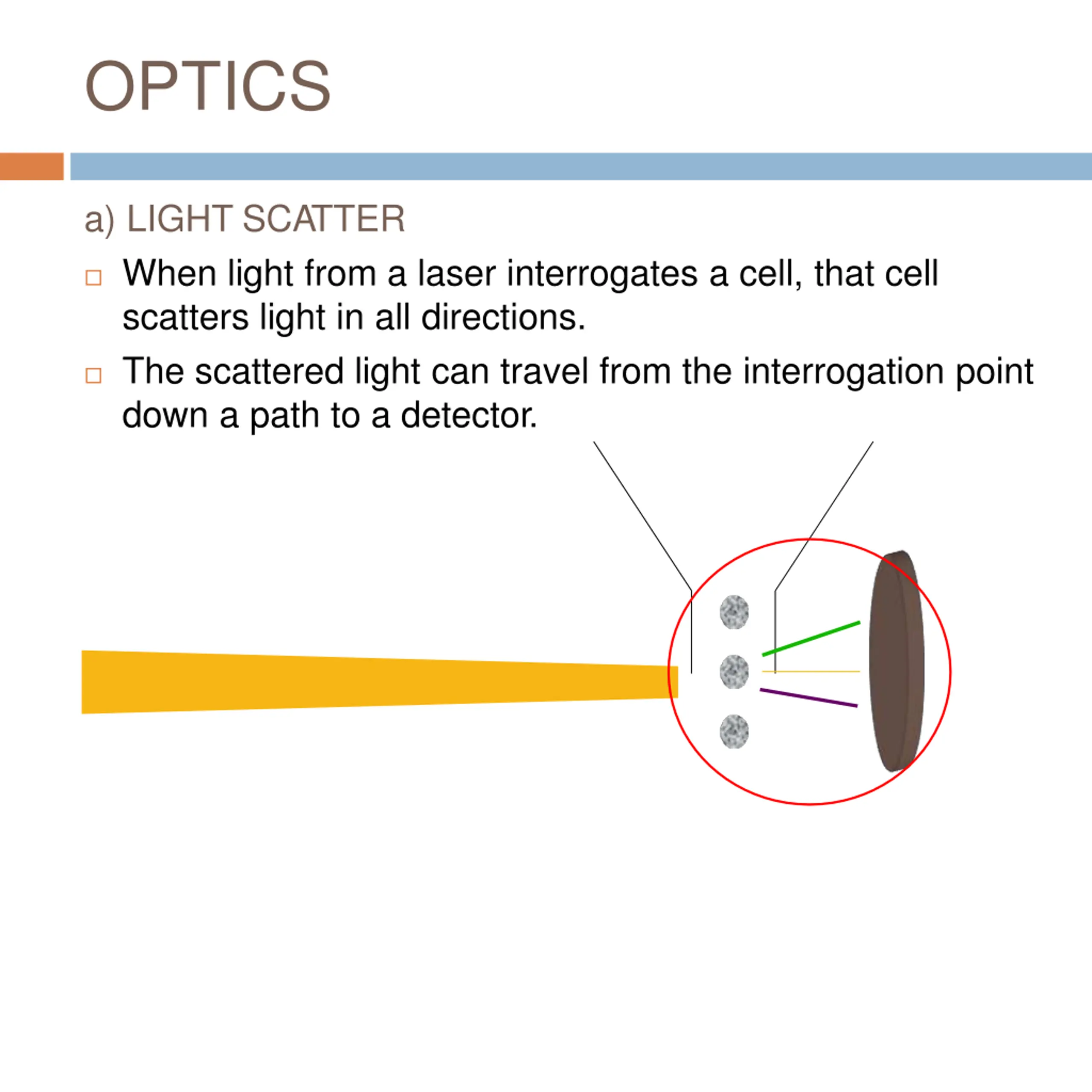 OPTICS a) LIGHT SCATTER When light from a laser interrogates a cell, that cell scatters light in all directions. The scattered light can travel from the interrogation point down a path to a detector.