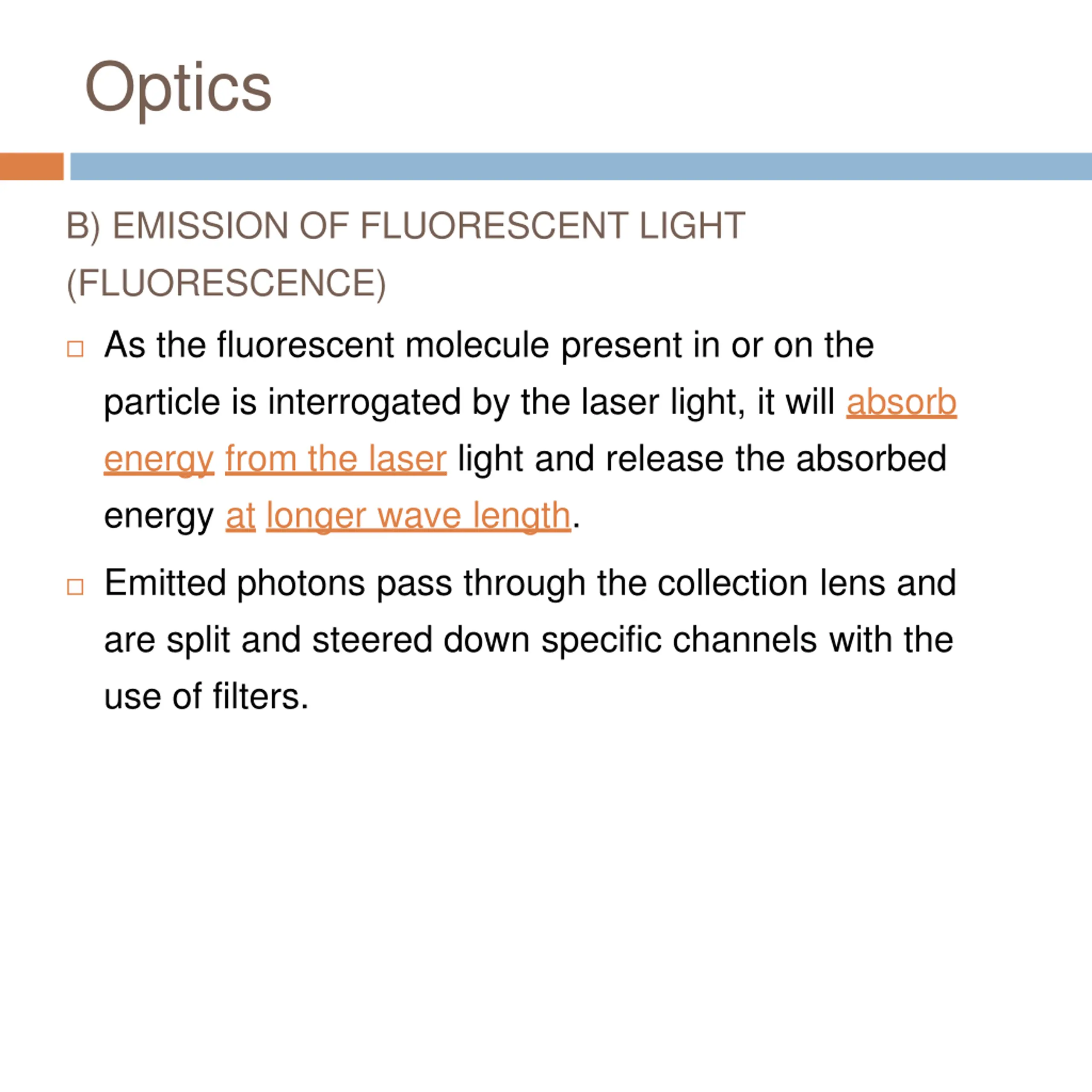 Optics B) EMISSION OF FLUORESCENT LIGHT (FLUORESCENCE) As the fluorescent molecule present in or on the particle is interrogated by the laser light, it will absorb energy from the laser light and release the absorbed energy at longer wave length. Emitted photons pass through the collection lens and are split and steered down specific channels with the use of filters.