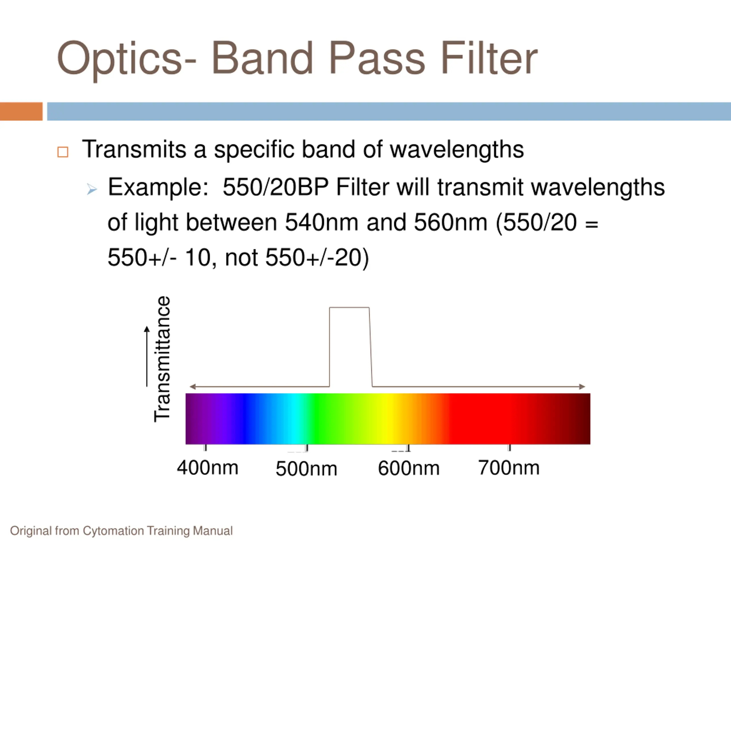 Optics- Band Pass Filter Transmits a specific band of wavelengths Example: 550/20BP Filter will transmit wavelengths of light between 540nm and 560nm (550/20 = 550+/- 10, not 550+/-20) Transmittance 400nm 700nm 600nm 500nm Original from Cytomation Training Manual