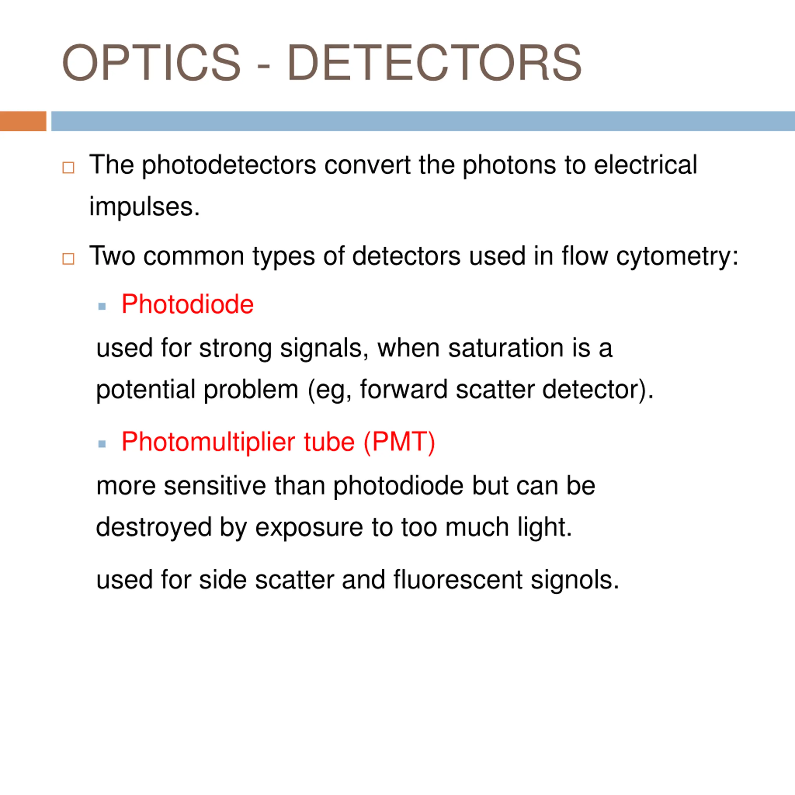 OPTICS - DETECTORS The photodetectors convert the photons to electrical impulses. Two common types of detectors used in flow cytometry: Photodiode used for strong signals, when saturation is a potential problem (eg, forward scatter detector). Photomultiplier tube (PMT) more sensitive than photodiode but can be destroyed by exposure to too much light. used for side scatter and fluorescent signols.