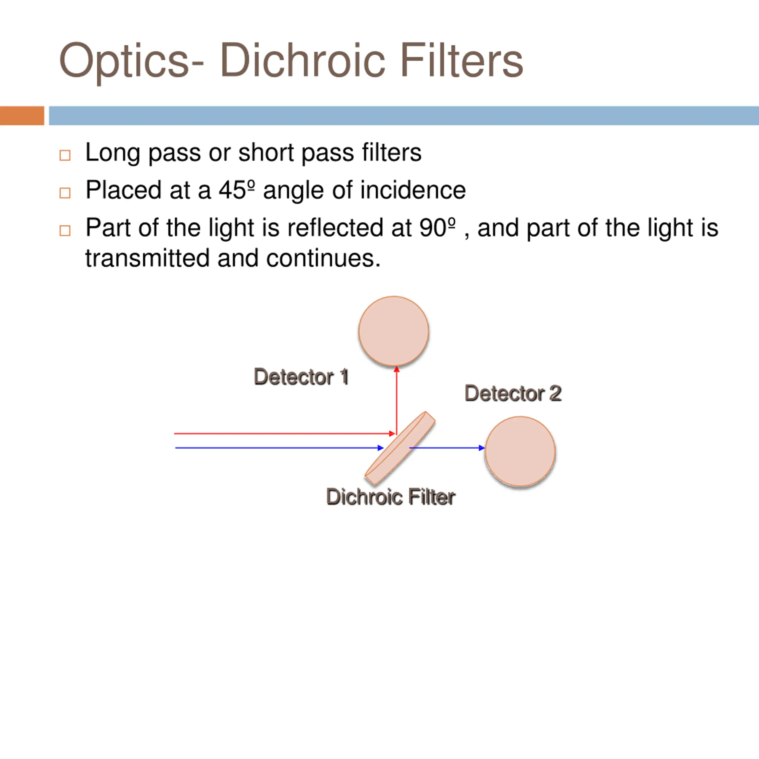 Optics- Dichroic Filters Long pass or short pass filters Placed at a 45 angle of incidence Part of the light is reflected at 90 , and part of the light is transmitted and continues. Detector 1 Detector 2 Dichroic Filter