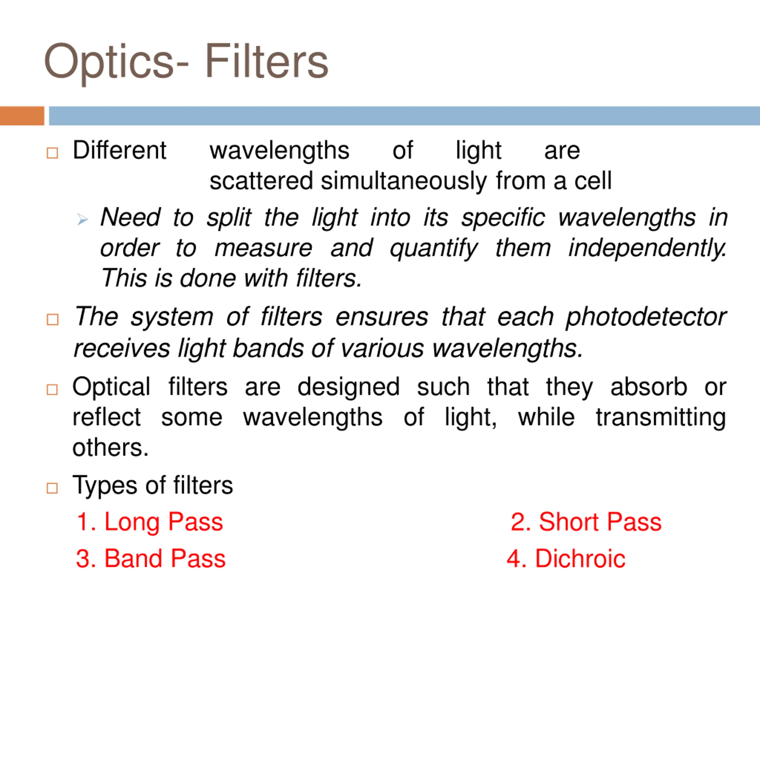 Optics- Filters Different wavelengths scattered simultaneously from a cell Need to split the light into its specific wavelengths in order to measure and quantify them independently. This is done with filters. of light are The system of filters ensures that each photodetector receives light bands of various wavelengths. are designed such that they absorb or wavelengths of light, while transmitting Optical filters reflect some others. Types of filters 1. Long Pass 3. Band Pass 2. Short Pass 4. Dichroic