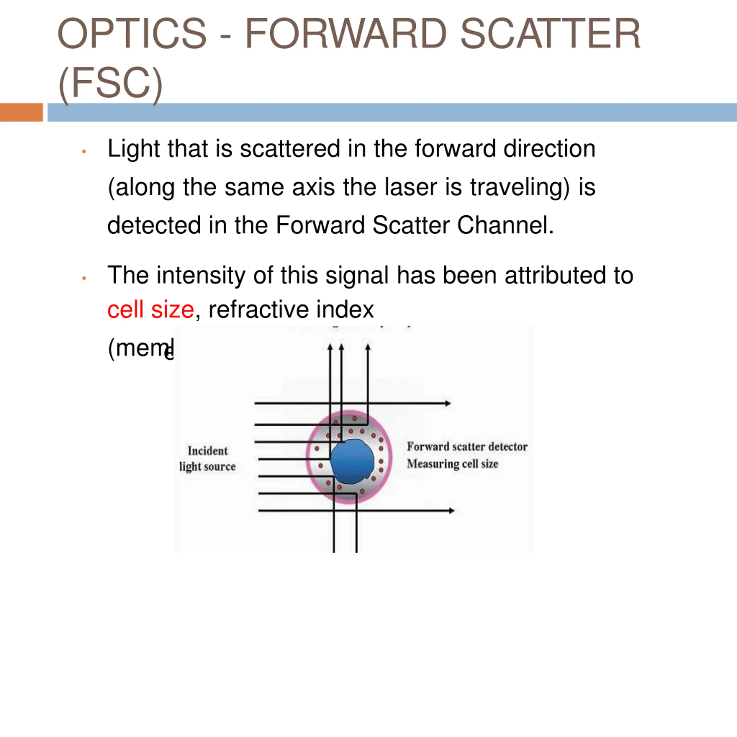 OPTICS - FORWARD SCATTER (FSC) Light that is scattered in the forward direction (along the same axis the laser is traveling) is detected in the Forward Scatter Channel. The intensity of this signal has been attributed to cell size, refractive index (membrane perm eability).