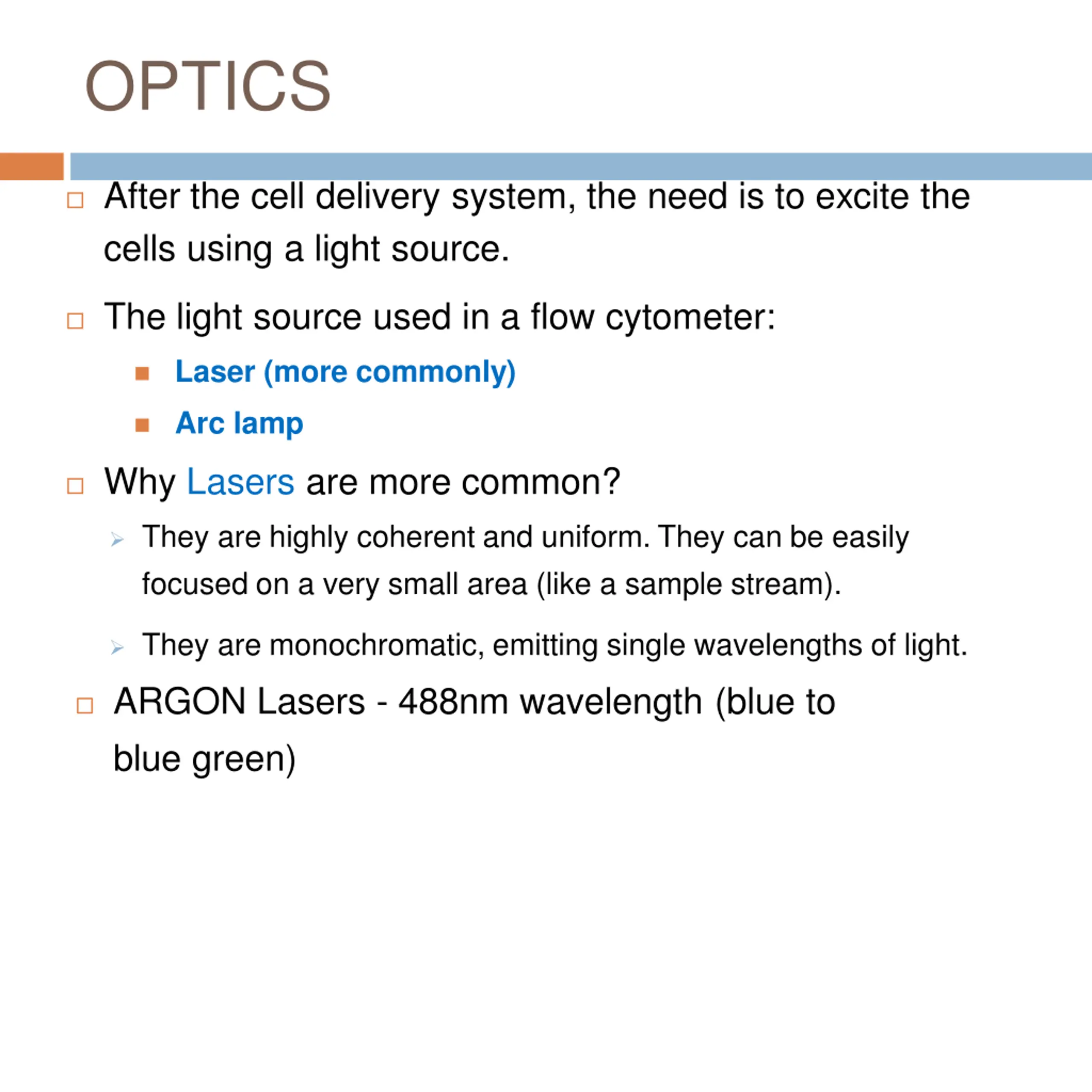 OPTICS After the cell delivery system, the need is to excite the cells using a light source. The light source used in a flow cytometer: Laser (more commonly) Arc lamp Why Lasers are more common? They are highly coherent and uniform. They can be easily focused on a very small area (like a sample stream). They are monochromatic, emitting single wavelengths of light. ARGON Lasers - 488nm wavelength (blue to blue green)