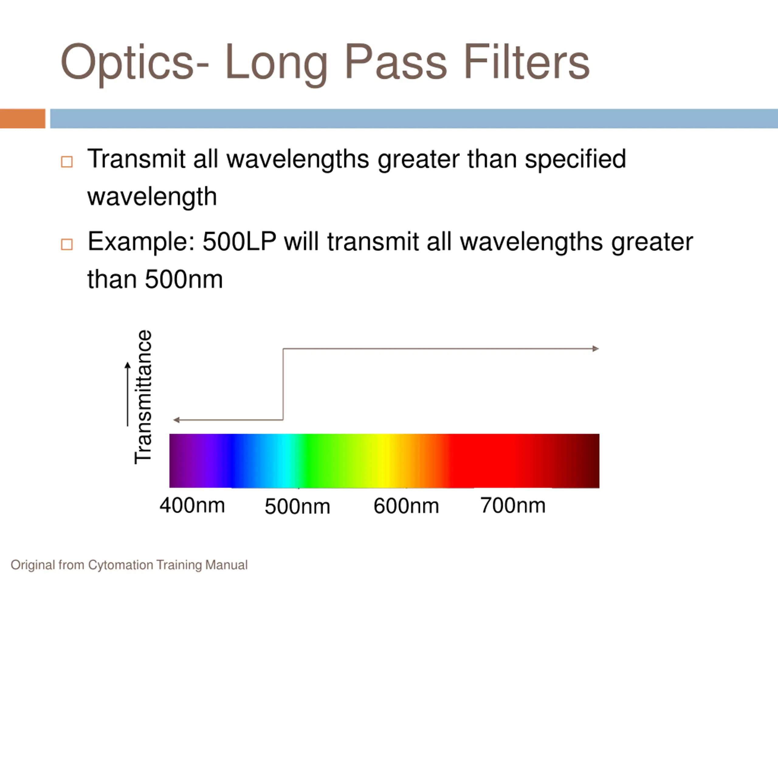 Optics- Long Pass Filters Transmit all wavelengths greater than specified wavelength Example: 500LP will transmit all wavelengths greater than 500nm Transmittance 400nm 700nm 600nm 500nm Original from Cytomation Training Manual