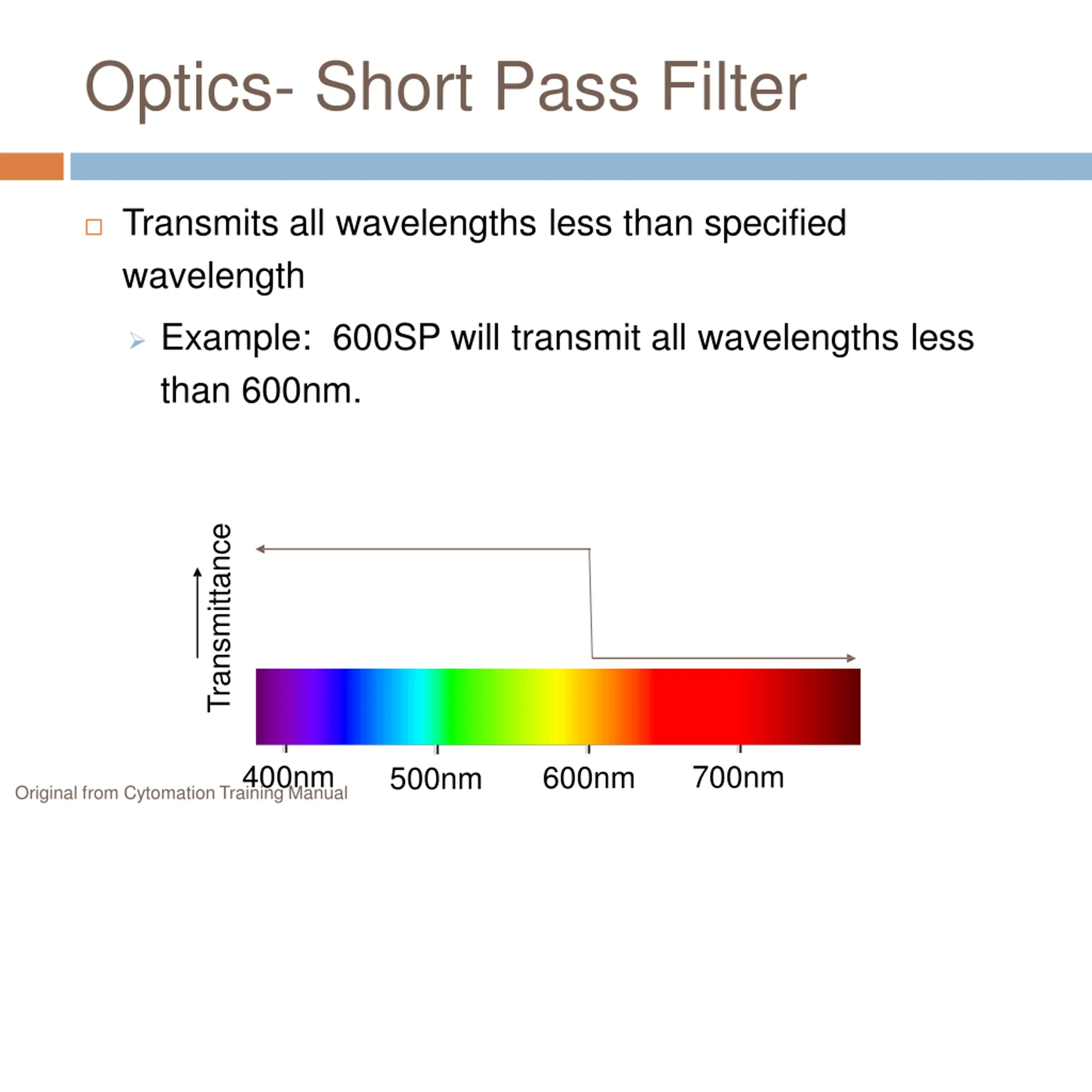 Optics- Short Pass Filter Transmits all wavelengths less than specified wavelength Example: 600SP will transmit all wavelengths less than 600nm. Transmittance 400nm 700nm 600nm 500nm Original from Cytomation Training Manual