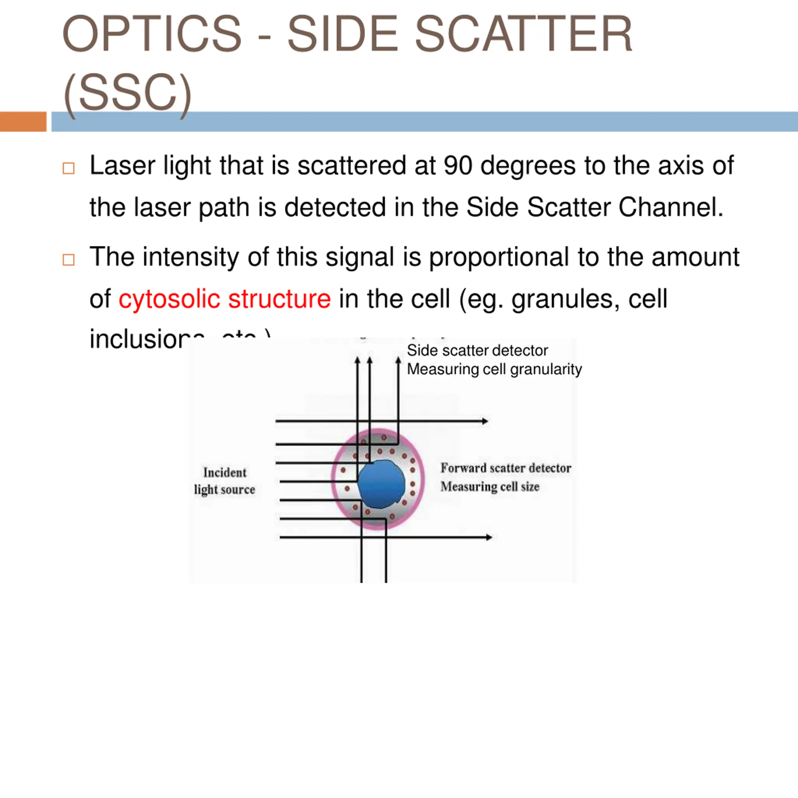 OPTICS - SIDE SCATTER (SSC) Laser light that is scattered at 90 degrees to the axis of the laser path is detected in the Side Scatter Channel. The intensity of this signal is proportional to the amount of cytosolic structure in the cell (eg. granules, cell inclusions, etc.) Side scatter detector Measuring cell granularity