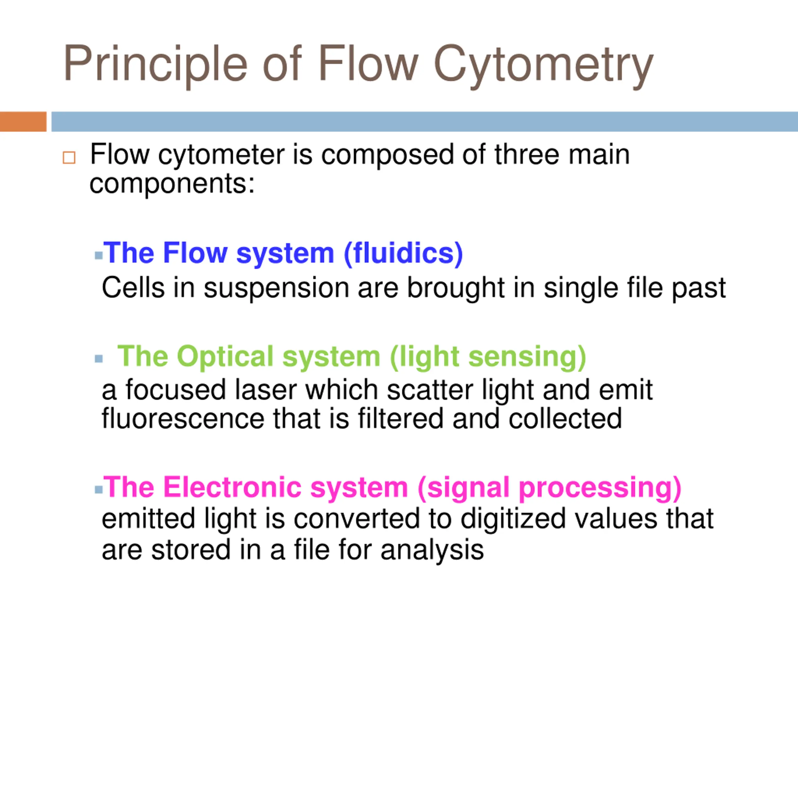 Principle of Flow Cytometry Flow cytometer is composed of three main components: The Flow system (fluidics) Cells in suspension are brought in single file past The Optical system (light sensing) a focused laser which scatter light and emit fluorescence that is filtered and collected The Electronic system (signal processing) emitted light is converted to digitized values that are stored in a file for analysis