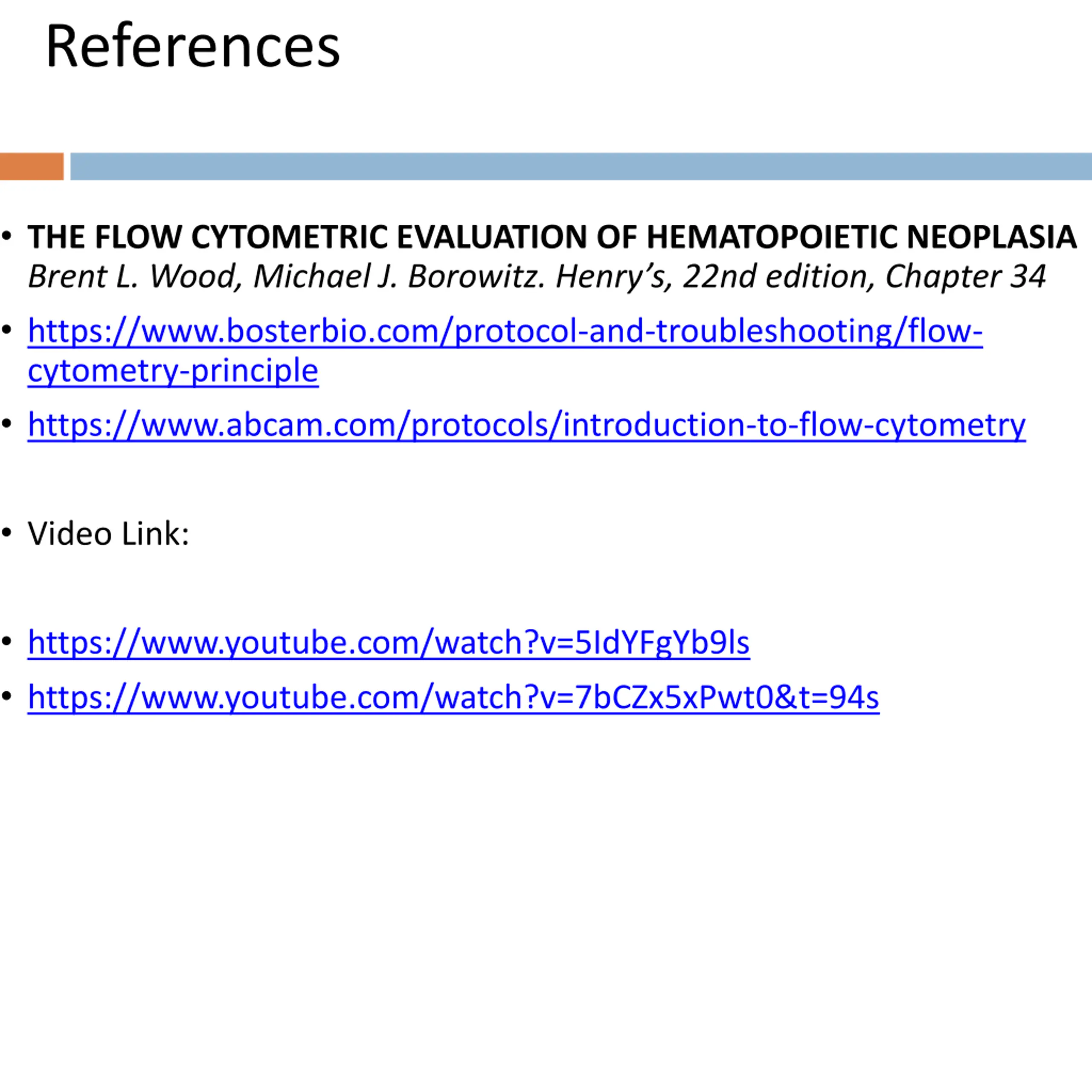 References THE FLOW CYTOMETRIC EVALUATION OF HEMATOPOIETIC NEOPLASIA Brent L. Wood, Michael J. Borowitz. Henry s, 22nd edition, Chapter 34 https://www.bosterbio.com/protocol-and-troubleshooting/flow- cytometry-principle https://www.abcam.com/protocols/introduction-to-flow-cytometry Video Link: https://www.youtube.com/watch?v=5IdYFgYb9ls https://www.youtube.com/watch?v=7bCZx5xPwt0&t=94s
