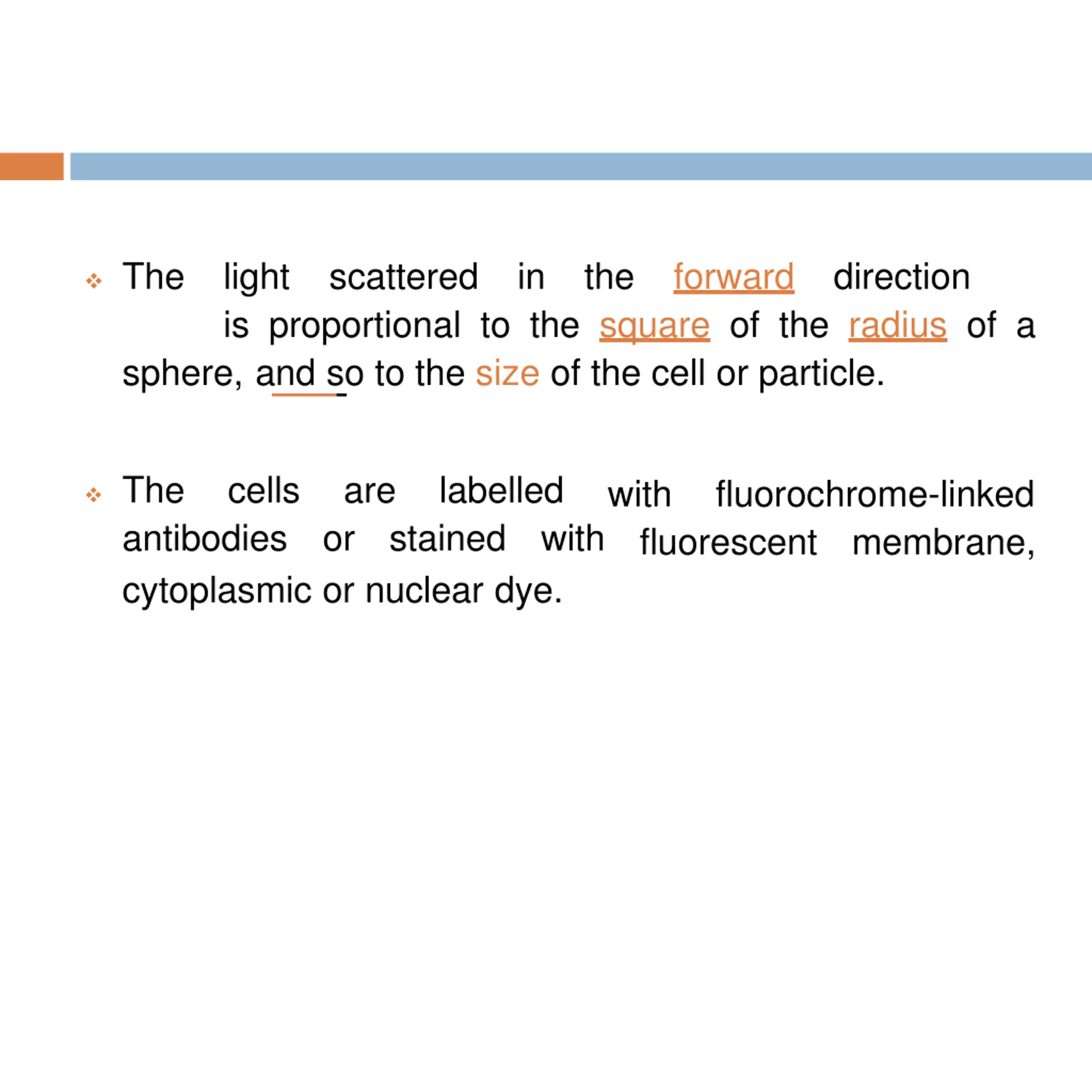The light is proportional to the square of the radius of a sphere, and so to the size of the cell or particle. scattered in the forward direction The antibodies cytoplasmic or nuclear dye. cells are or labelled stained with fluorescent fluorochrome-linked membrane, with