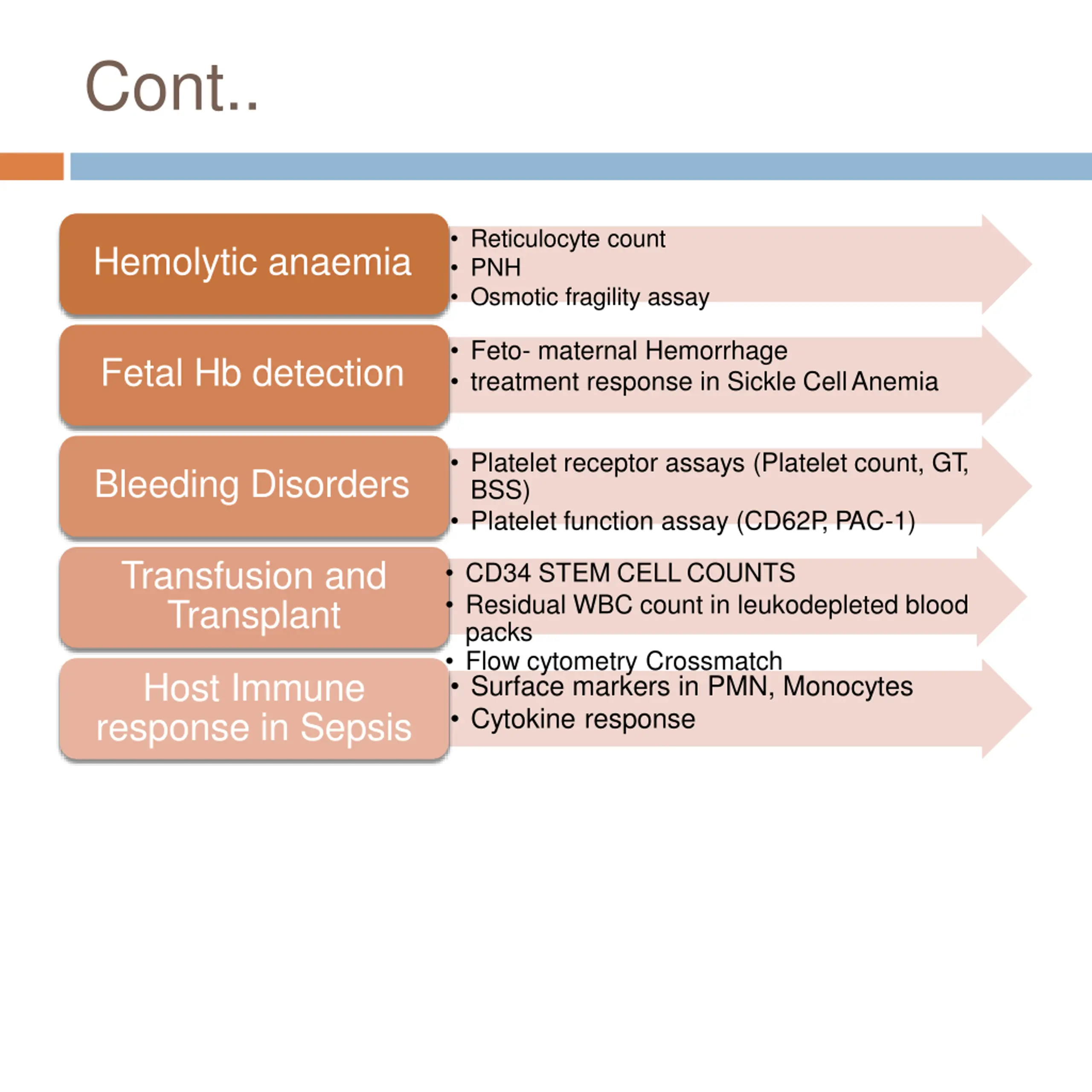Cont.. Reticulocyte count PNH Osmotic fragility assay Hemolytic anaemia Feto- maternal Hemorrhage treatment response in Sickle CellAnemia Fetal Hb detection Platelet receptor assays (Platelet count, GT , BSS) Platelet function assay (CD62P , PAC-1) Bleeding Disorders Transfusion and Transplant CD34 STEM CELLCOUNTS Residual WBC count in leukodepleted blood packs Flow cytometry Crossmatch Surface markers in PMN, Monocytes Cytokine response Host Immune response in Sepsis