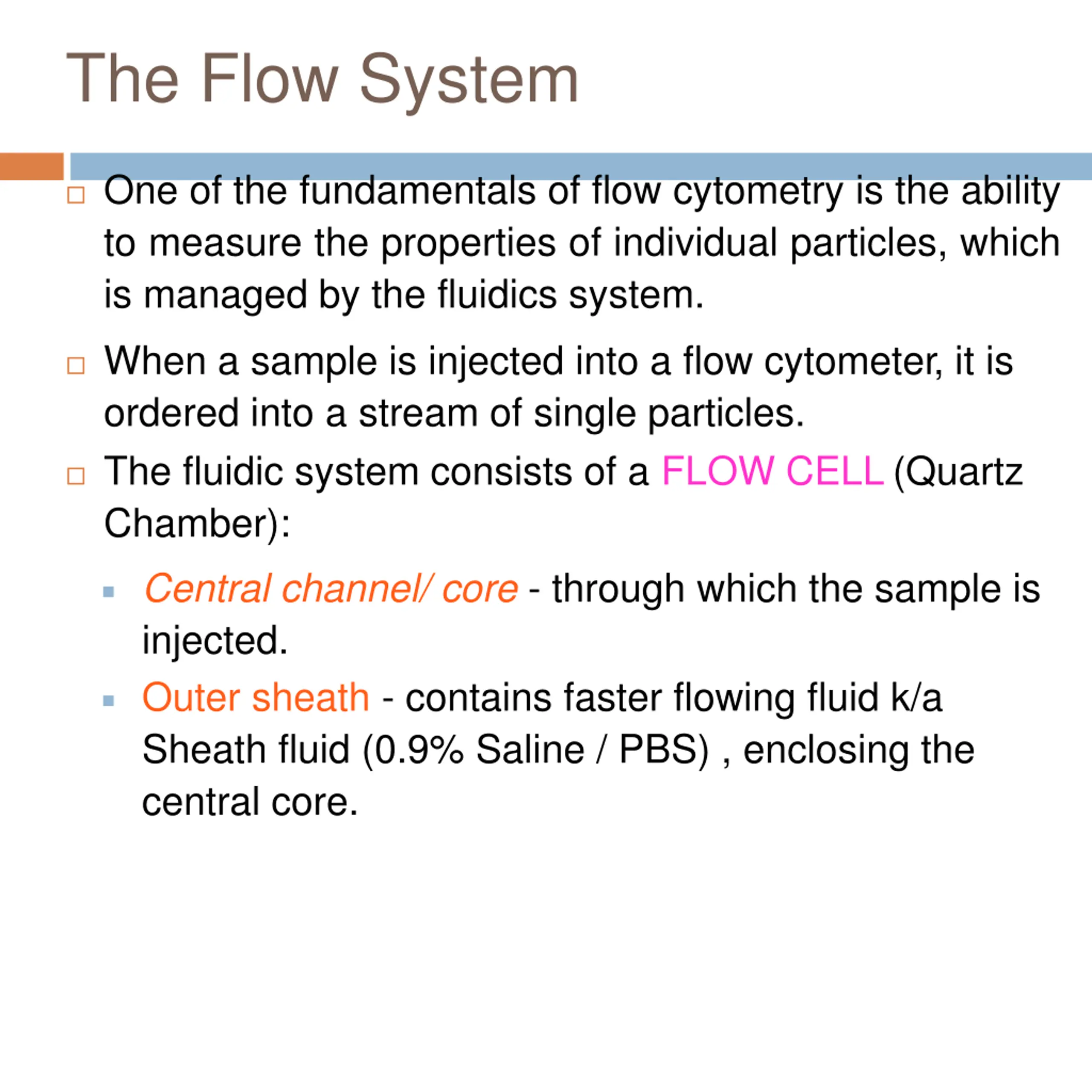 The Flow System One of the fundamentals of flow cytometry is the ability to measure the properties of individual particles, which is managed by the fluidics system. When a sample is injected into a flow cytometer, it is ordered into a stream of single particles. The fluidic system consists of a FLOW CELL(Quartz Chamber): Central channel/ core - through which the sample is injected. Outer sheath - contains faster flowing fluid k/a Sheath fluid (0.9% Saline / PBS) , enclosing the central core.