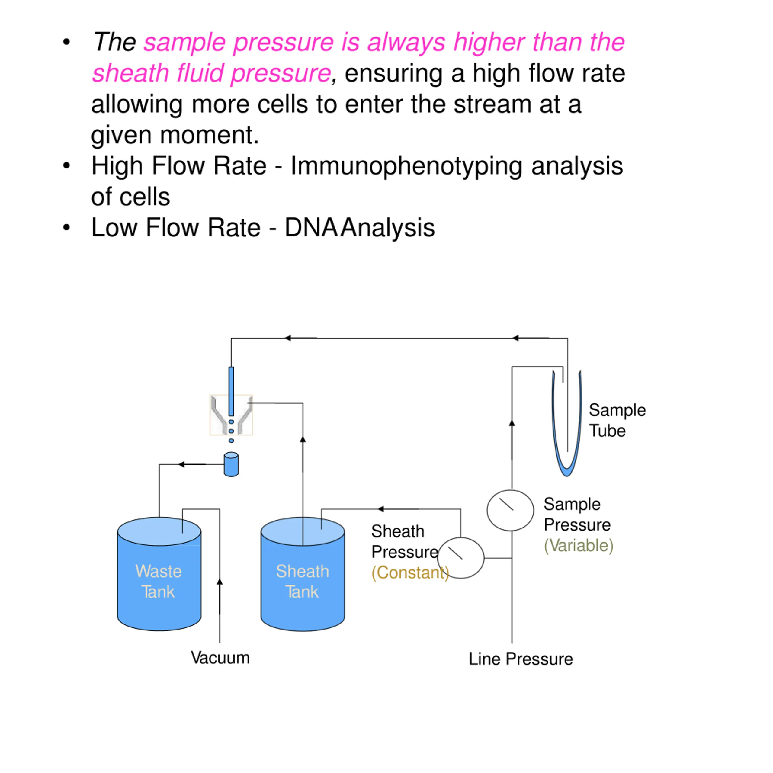 The sample pressure is always higher than the sheath fluid pressure, ensuring a high flow rate allowing more cells to enter the stream at a given moment. High Flow Rate - Immunophenotyping analysis of cells Low Flow Rate - DNAAnalysis Sample Tube Sample Pressure (Variable) Sheath Pressure (Constant) Waste T ank Sheath T ank Vacuum Line Pressure