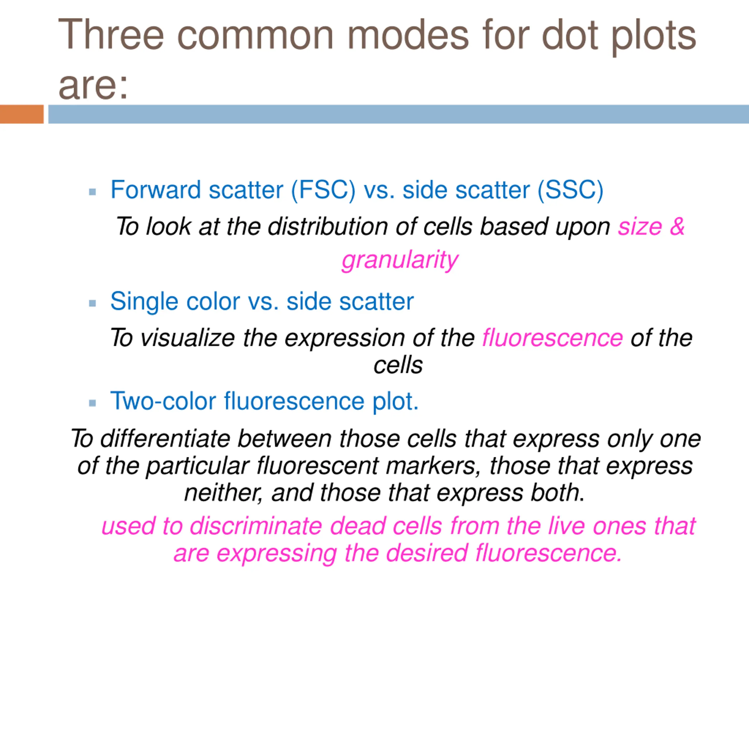 Three common modes for dot plots are: Forward scatter (FSC) vs. side scatter (SSC) To look at the distribution of cells based upon size & granularity Single color vs. side scatter To visualize the expression of the fluorescence of the cells Two-color fluorescence plot. To differentiate between those cells that express only one of the particular fluorescent markers, those that express neither, and those that express both. used to discriminate dead cells from the live ones that are expressing the desired fluorescence.