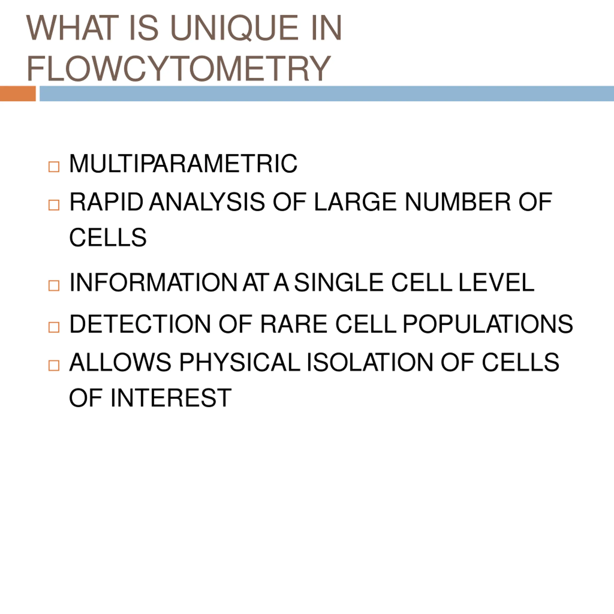 WHAT IS UNIQUE IN FLOWCYTOMETRY MULTIPARAMETRIC RAPIDANALYSIS OF LARGE NUMBER OF CELLS INFORMATIONATASINGLE CELL LEVEL DETECTION OF RARE CELLPOPULATIONS ALLOWS PHYSICAL ISOLATION OF CELLS OF INTEREST