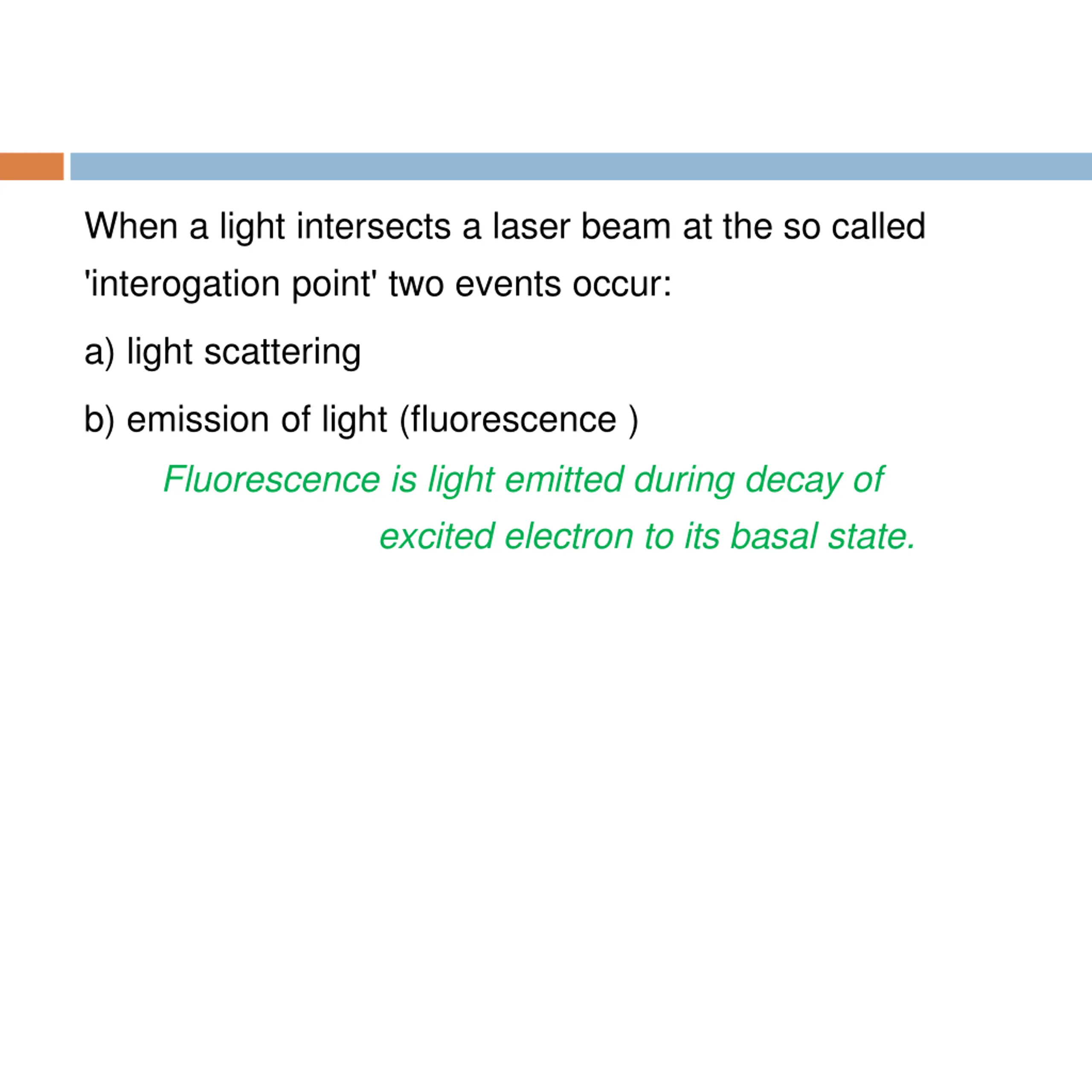 When a light intersects a laser beam at the so called 'interogation point' two events occur: a) light scattering b) emission of light (fluorescence ) Fluorescence is light emitted during decay of excited electron to its basal state.