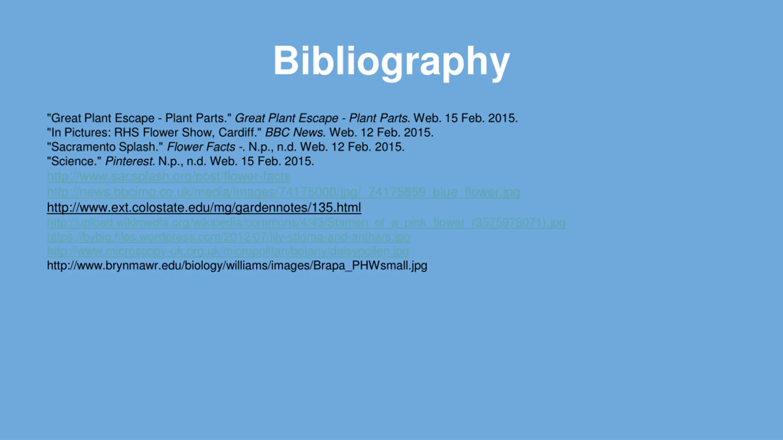 Bibliography "Great Plant Escape - Plant Parts." Great Plant Escape - Plant Parts. Web. 15 Feb. 2015. "In Pictures: RHS Flower Show, Cardiff." BBC News. Web. 12 Feb. 2015. "Sacramento Splash." Flower Facts -. N.p., n.d. Web. 12 Feb. 2015. "Science." Pinterest. N.p., n.d. Web. 15 Feb. 2015. http://www.sacsplash.org/post/flower-facts http://news.bbcimg.co.uk/media/images/74175000/jpg/_74175859_blue_flower.jpg http://www.ext.colostate.edu/mg/gardennotes/135.html http://upload.wikimedia.org/wikipedia/commons/4/43/Stamen_of_a_pink_flower_(3575978071).jpg https://bybio.files.wordpress.com/2012/07/lily-stigma-and-anthers.jpg http://www.microscopy-uk.org.uk/micropolitan/botany/daisypollen.jpg http://www.brynmawr.edu/biology/williams/images/Brapa_PHWsmall.jpg